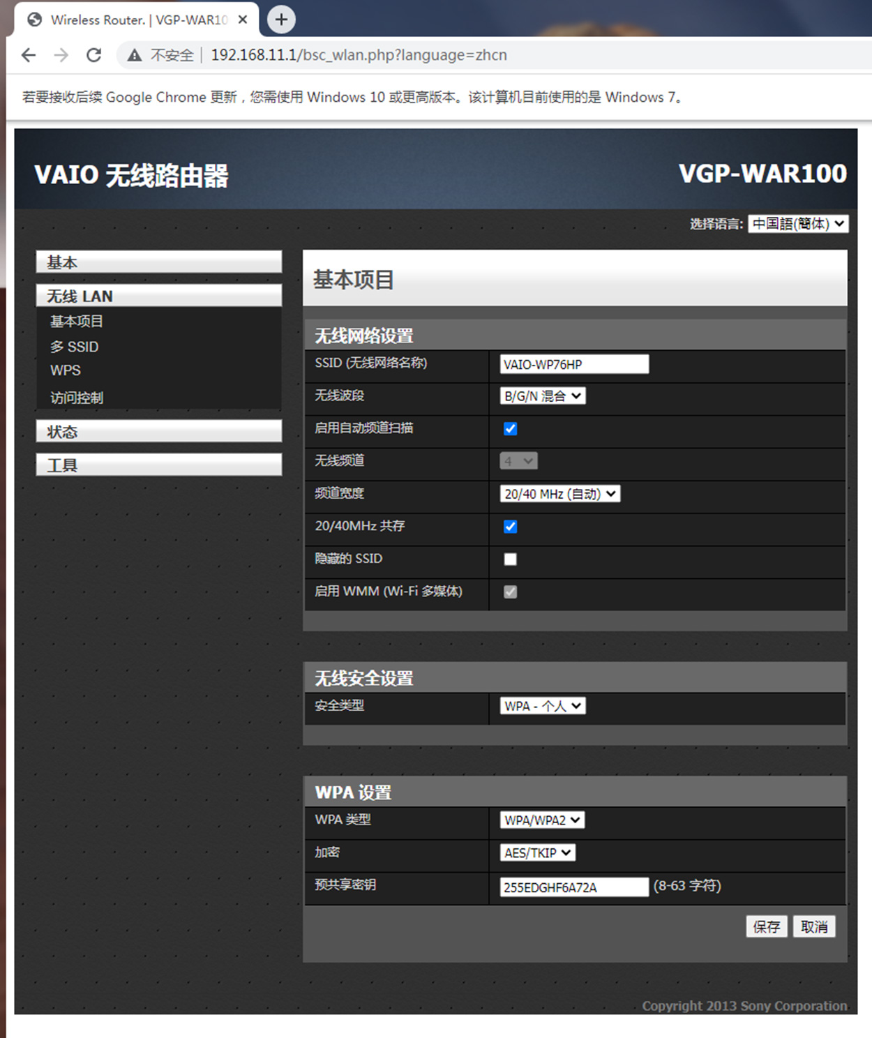 更改SONY VGP-WAR100互联网连接设置及配置高级设置–使用您的网页浏览器访问无线路由器的设置页面。启动网页浏览器,然后输入以下 URL:http://VGP-WAR100/ 或 http://192.168.11.1 输入以下密码admin,然后选择“登录” 要更改设置页面的语言,请在显示屏右上角的“选择语言”中选择其他语言,支持中文。