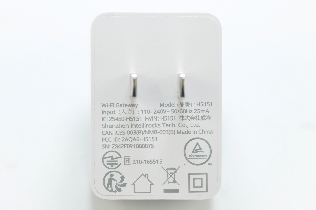 Govee H5151 Wi-Fi 网关背面实物印字如下图,Wi-Fi Gateway Model (品番):H5151 Input (1) : 110-240V~50/60Hz25mA IC: 25450-H5151 HVIN: H5151 株式会社成洋 Shenzhen Intellirocks Tech.Co., Ltd. CAN ICES-003(B)/NMB-003(B) Made in China
