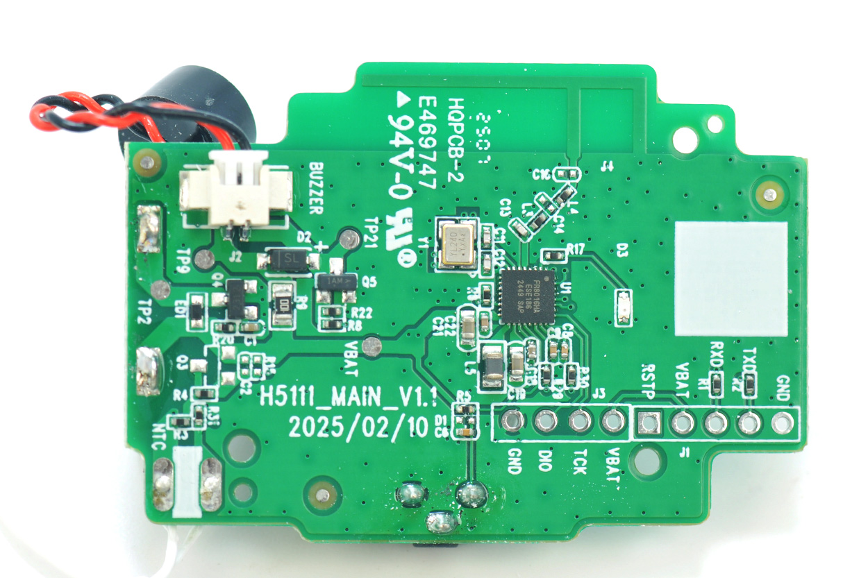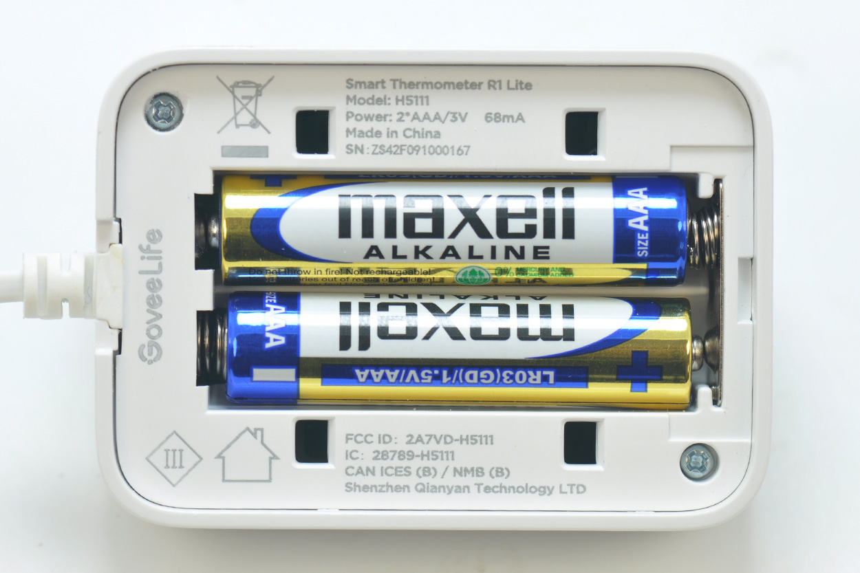 Smart Thermometer R1 Lite H5111 的智能体温计背面标签印字如下图,Smart Thermometer R1 Lite Model: H5111 Power: 2*AAA/3V 68mA Made in China 产地中国