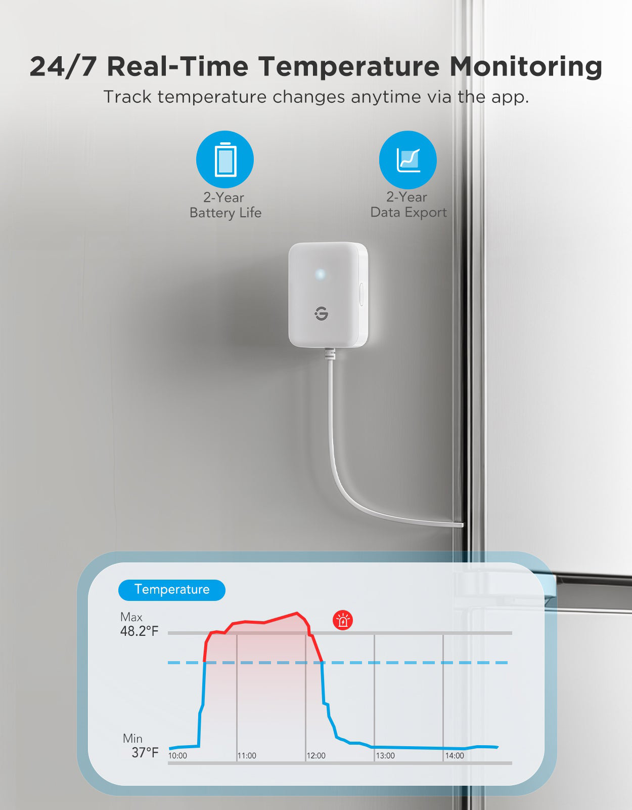 智能三向警报和远程温度监控:当温度超出预设范围时,可立即通过应用程序通知、电子邮件警报和蜂鸣器发出警报,并提供全天候远程监控,提供全面保护。
