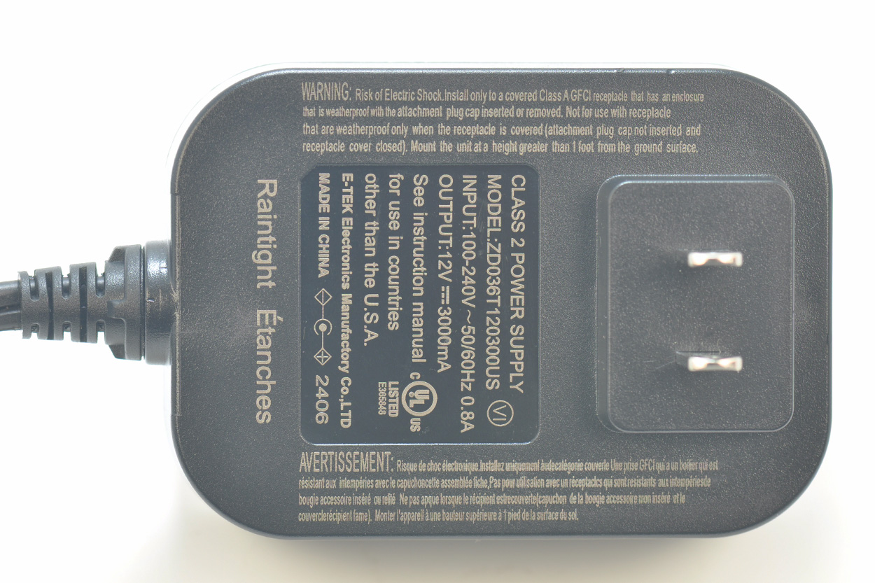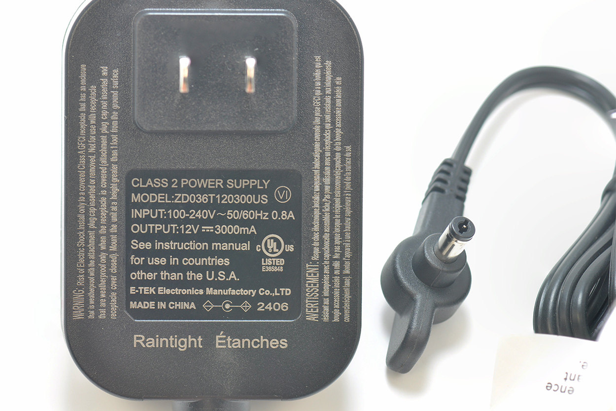 底部标签印字如下,CLASS 2 POWER SUPPLY MODEL:ZD036T120300US INPUT:100-240V~50/60Hz 0.8A OUTPUT:12V 3000mA See instruction manual c for use in countries LISTED E365848 other than the U.S.A. E-TEK Electronics Manufactory Co., LTD MADE IN CHINA 中国E-TEK给它代工的,生产日期是24年06周。
