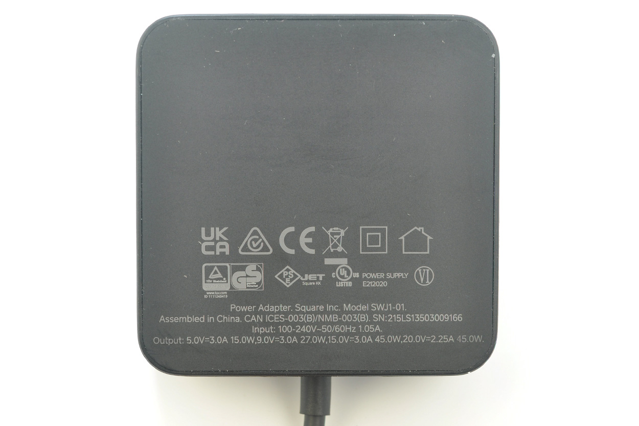底部标签印字如下 Power Adapter. Square Inc. Model SWJ1-01. Assembled in China. CAN ICES-3(B)/NMB-3(B). Input: 100-240V~50/60Hz 1.4A. Output: 5V=3A,9V=3A,15V=3A,20V=2.25A. 45W,上面是各种各样的认证。