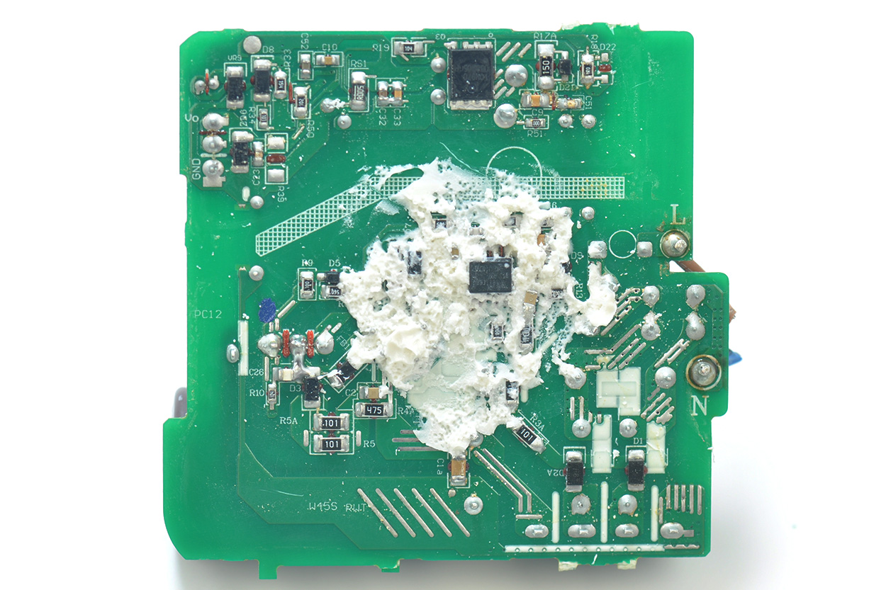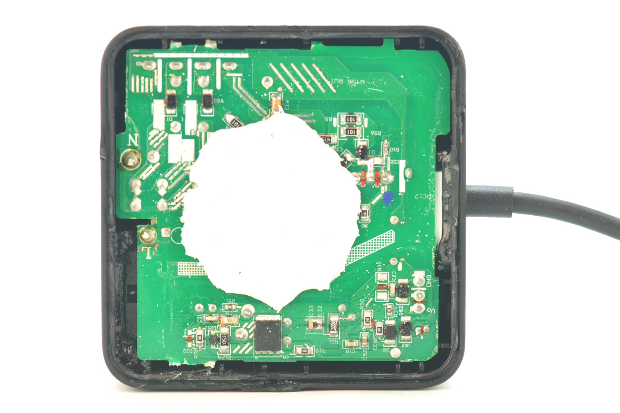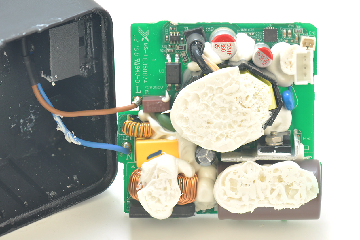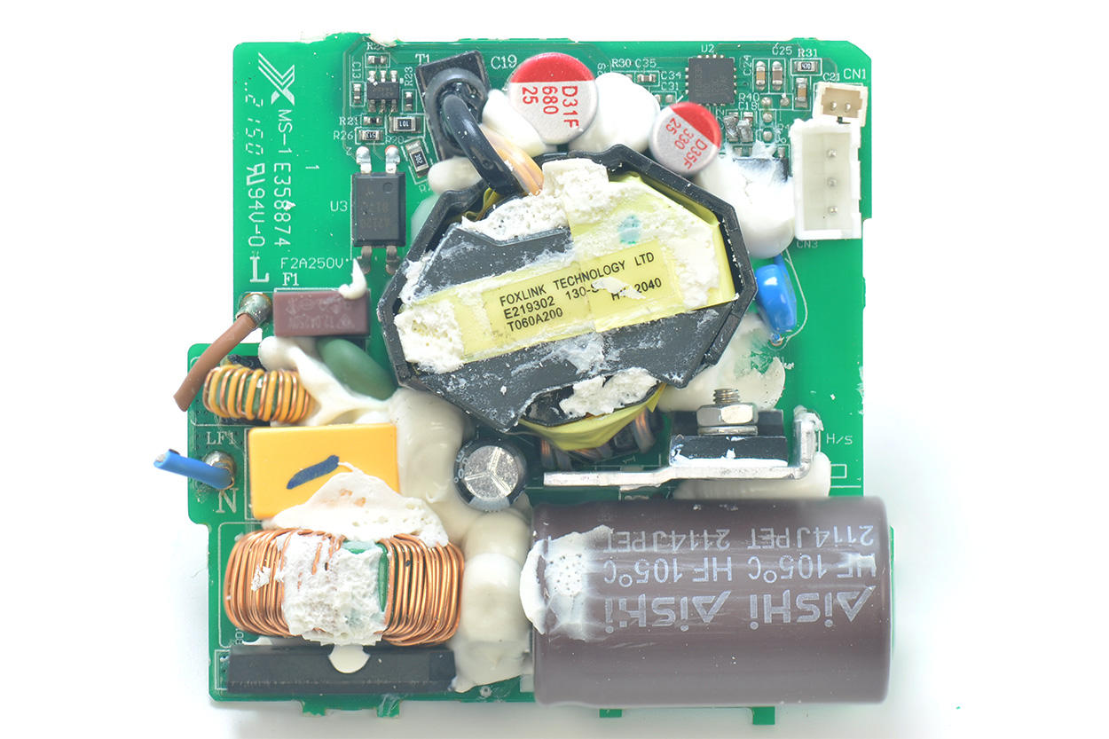 开壳后,电源主板背面实物如下图,有大块的注胶。