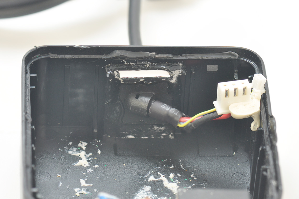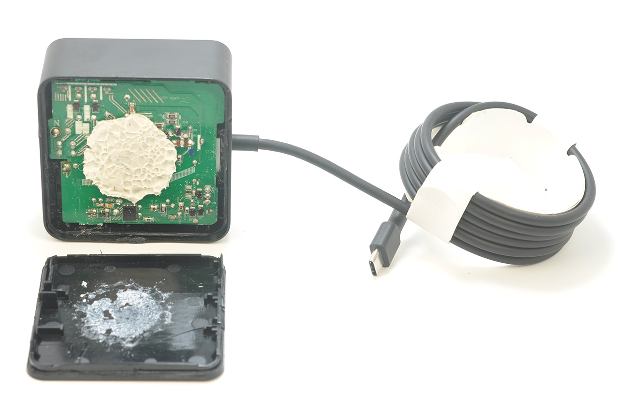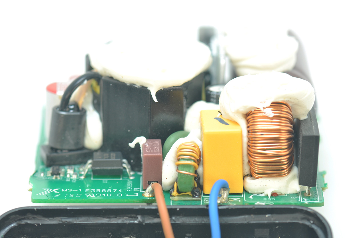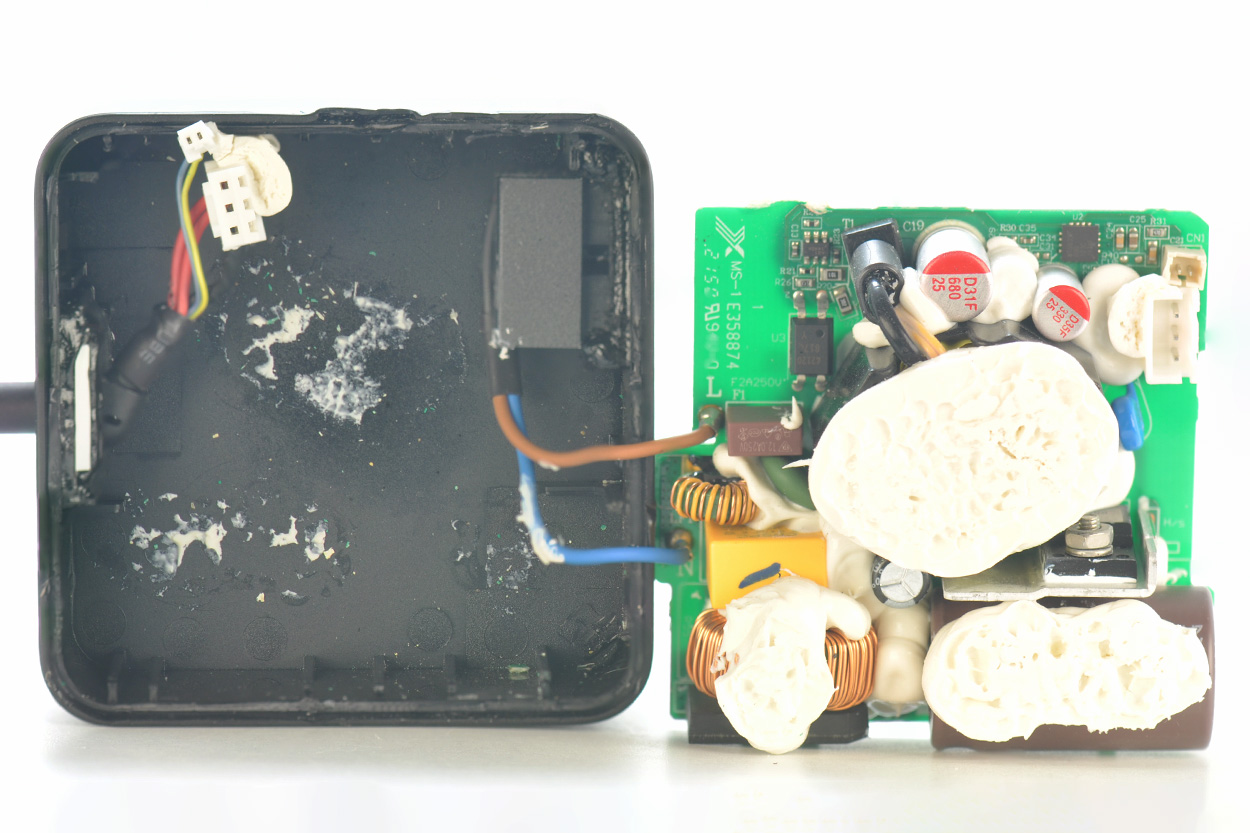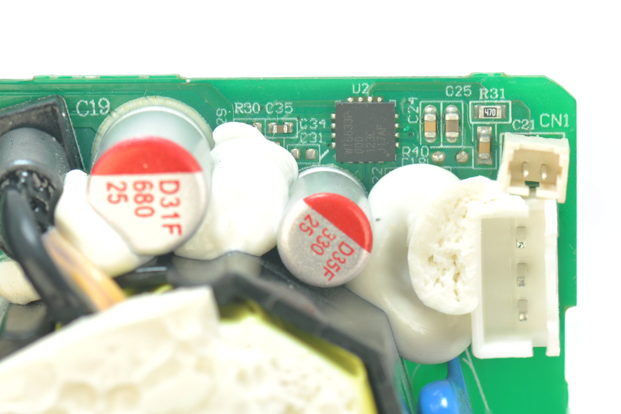 开壳后,电源主板背面实物如下图,有大块的注胶。