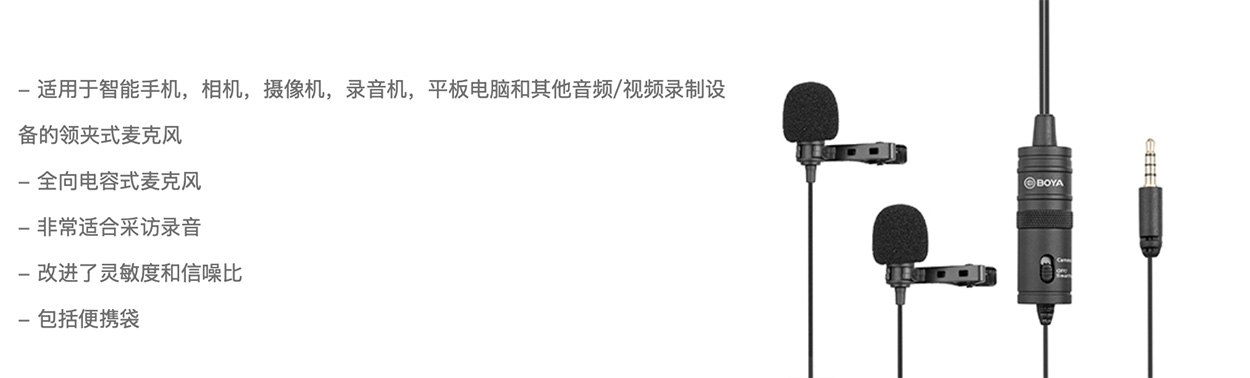 BOYA BY-M1DM是一个双领夹通用型麦克风,具有单个1/8″立体声连接,它可以与智能手机,单反相机,摄像机,音频记录器,个人电脑和其他记录设备中使用。