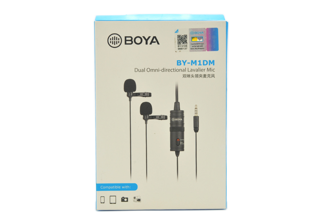BOYA BY- M1DM包装盒正面如下图,这个是双咪头的领夹麦克风。