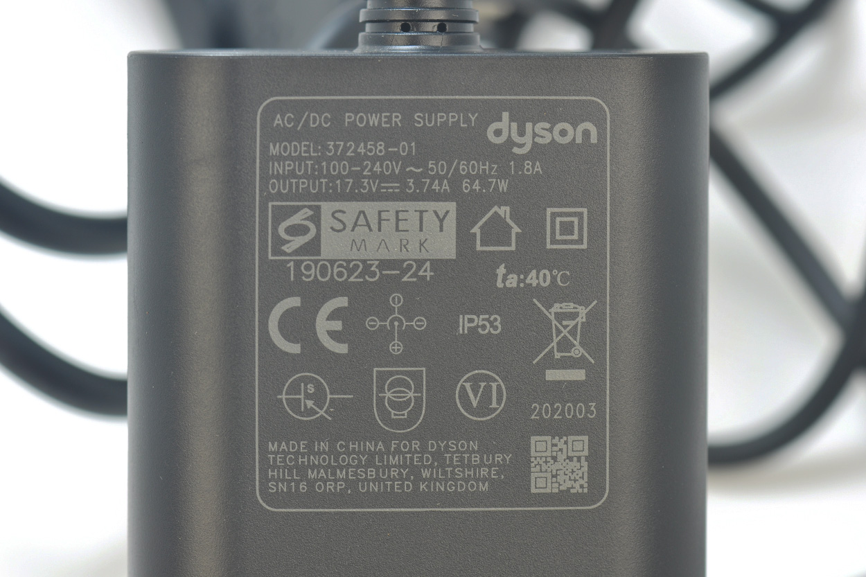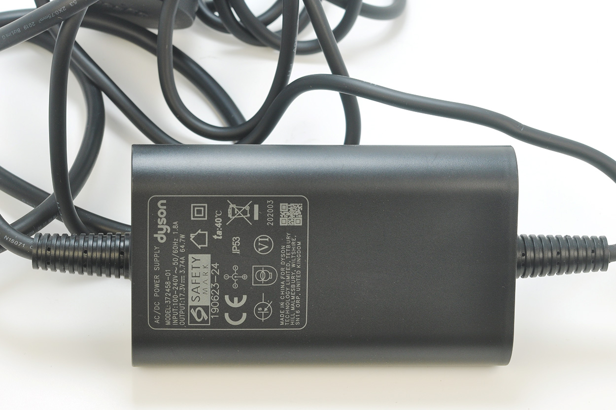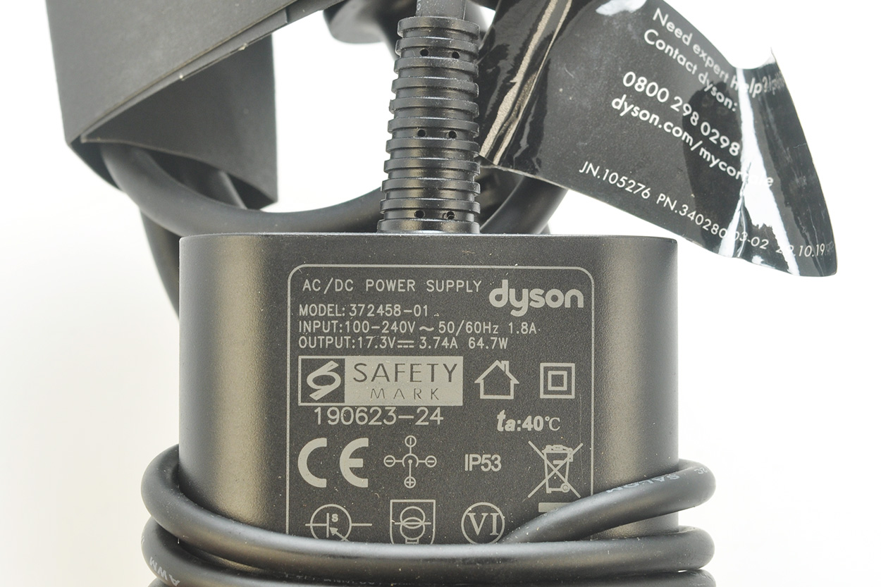 电源标签细节如下图 dyson AC/DC Power Supply Model型号372458-01 输入100-240V 输出17.3V 3.74A 64.7W 190623 产地中国