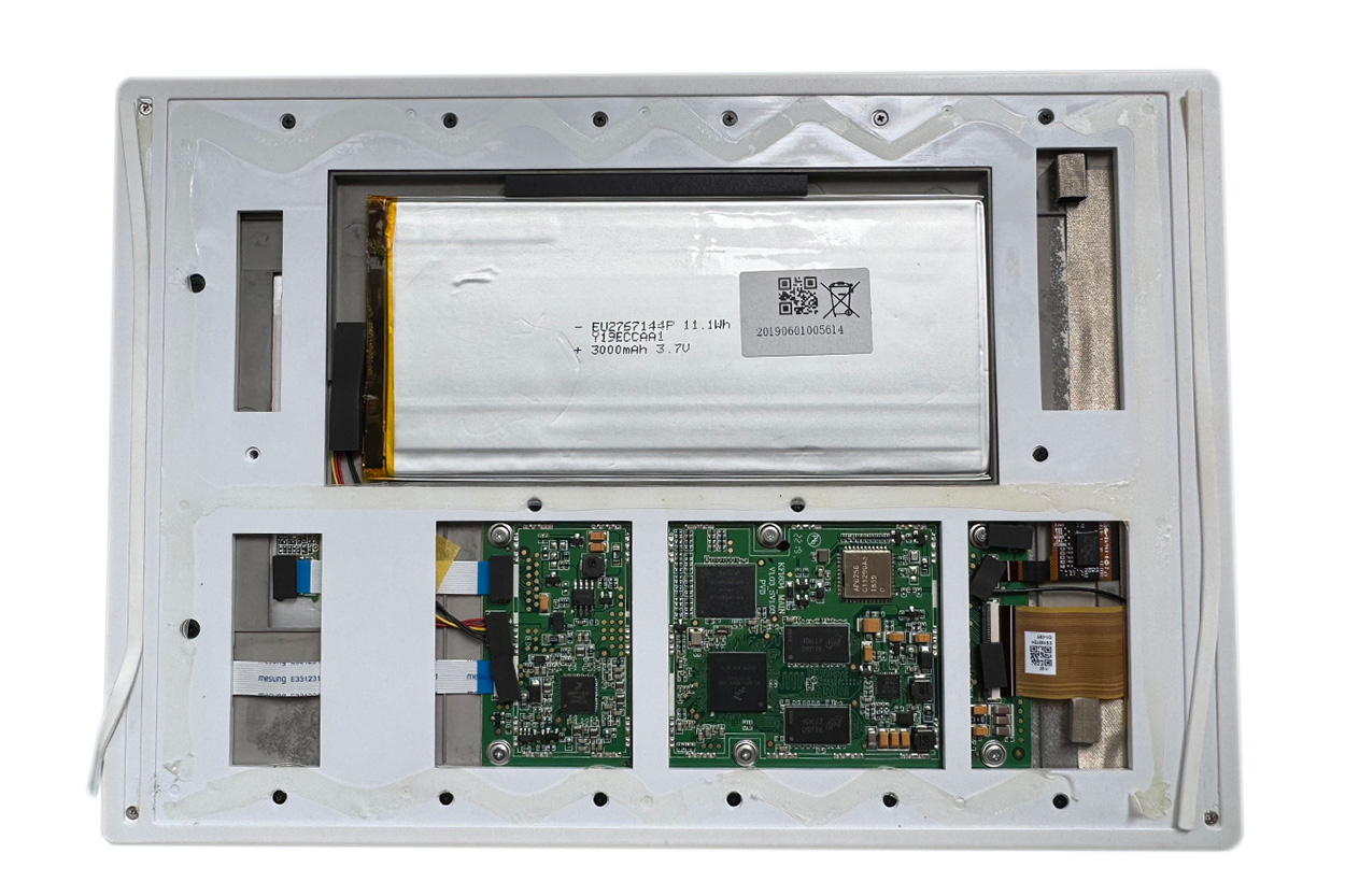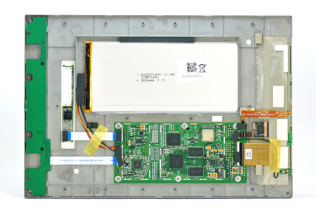 拧下所有22颗螺丝后,即可将塑料框架与主板固定框架分离。注意,这两个部件之间还有一些胶水/填充物!因此,分离这两个部件时务必小心。分离后电子屏幕面如下图。