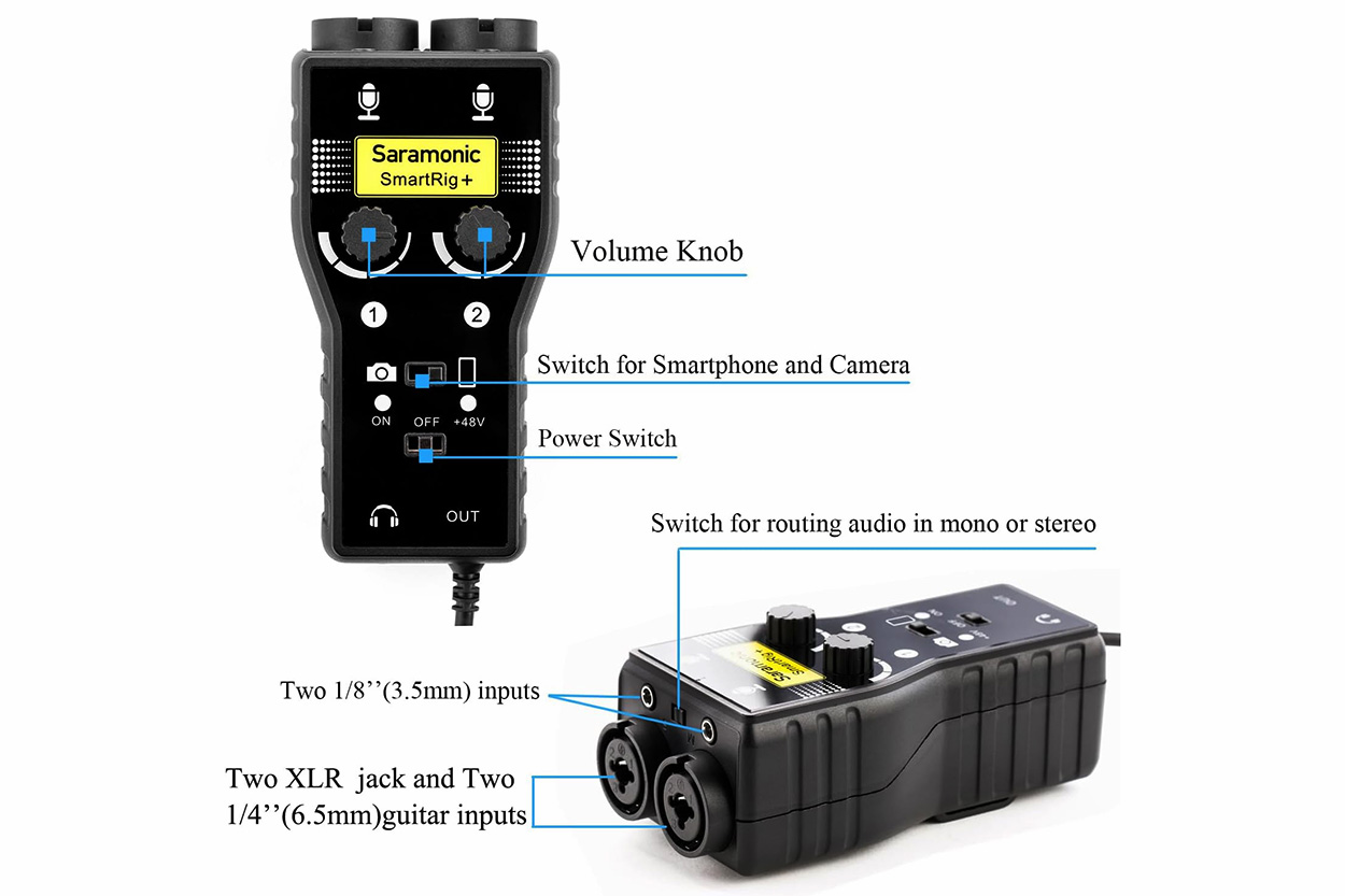 枫笛Saramonic SmartRig+ 2通道XLR转3.5mm麦克风音频混音器正面双通道实物如下图。