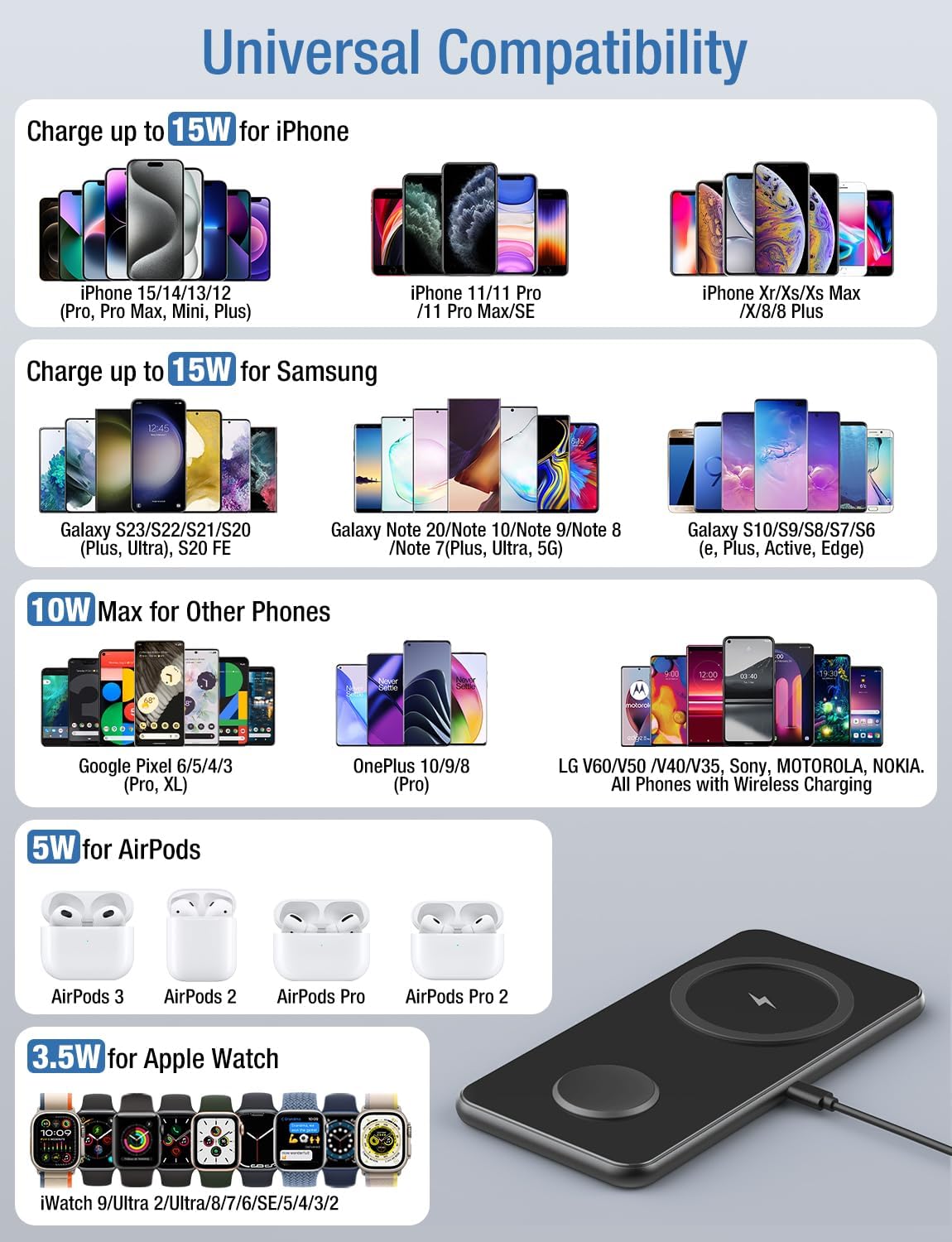 这款无线充电器可同时为手机(或苹果蓝牙耳机)与苹果手表充电。15W 快充模式:兼容 iPhone 14/14 Plus/14 Pro/14 Pro Max/13/13 Pro/13 Pro Max/13 mini/12/12 Pro/12 Pro Max/12 mini/SE/11/11 Pro/11 Pro Max/Xr/Xs/Xs Max/X/8/8 Plus,以及三星 S22/S21/S20/Note 10/Note 10 Plus/S10/S10 Plus/S10E 等机型,同时适配所有支持无线充电的手机;5W 充电模式:适配 AirPods 3/2/Pro;3.5W 充电模式:适配 Apple Watch Ultra/8/7/6/SE/5/4/3/2。