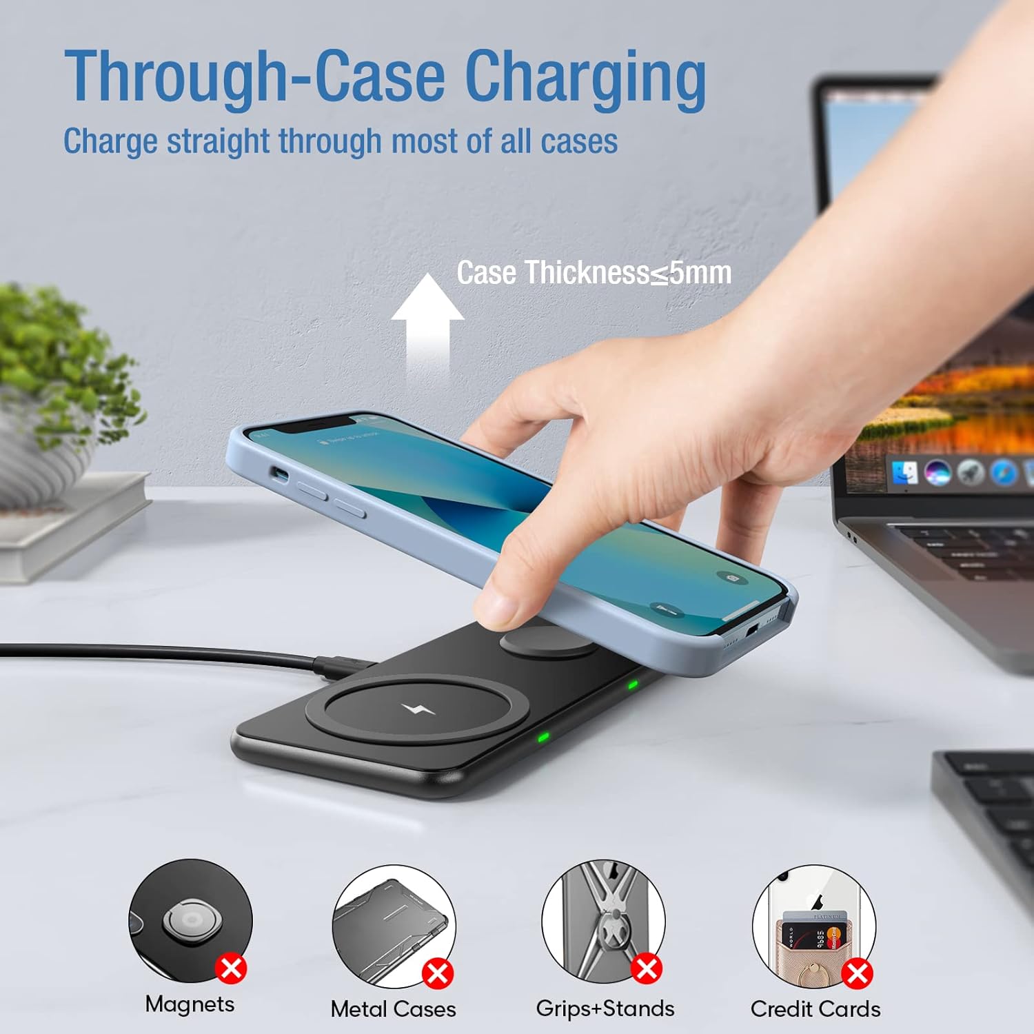 带壳充电 不扰睡眠–该无线充电板可穿透厚度≤5 毫米(0.2 英寸)的绝大多数手机壳进行充电,无需反复拆卸手机壳,只需将设备放置于充电区域即可。需注意远离金属配件,避免干扰充电进程。设备充电 10 秒后,指示灯会自动熄灭,全程静音不打扰睡眠。