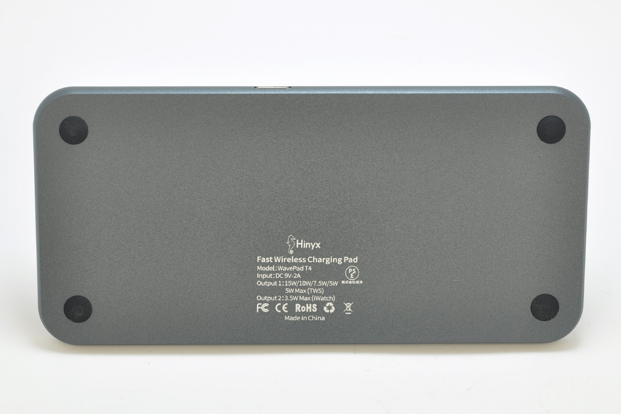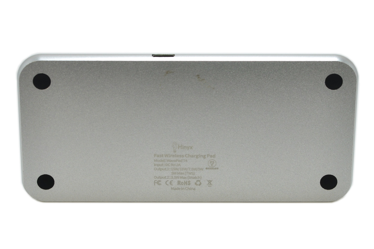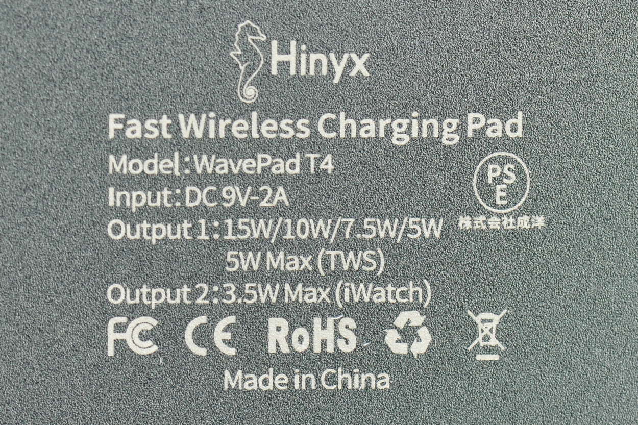 底部标签如下图 Hinyx Fast Wireless Charging Pad Moeel:WavePad T4 Inptu输入:DC 9V-2A (实测5V3A也能用)大线圈Output1:15W/10W/7.5W/5W Max(TWS) 小线圈Output2: 3.5W Max (iWatch)