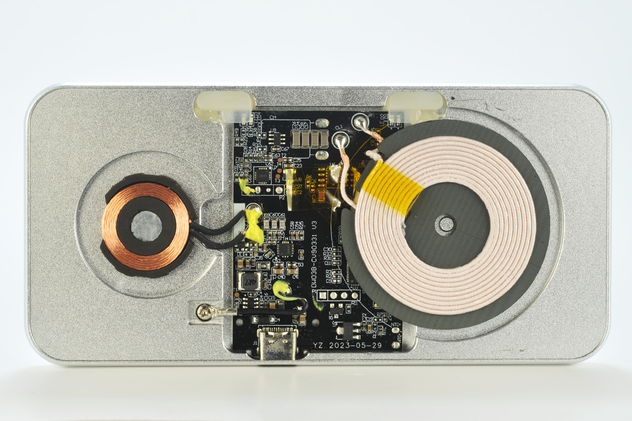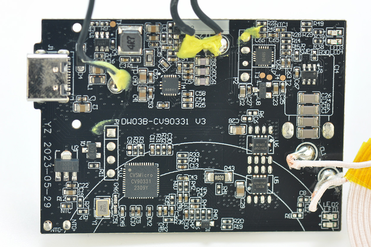 电源板正面如下图,主芯片采用CVSMicro劲芯微电子的 CV90331 芯片,主要应用于支持 Qi 协议的无线充电设备无线充电发射控制 SoC,板子整体做工感觉还不错。