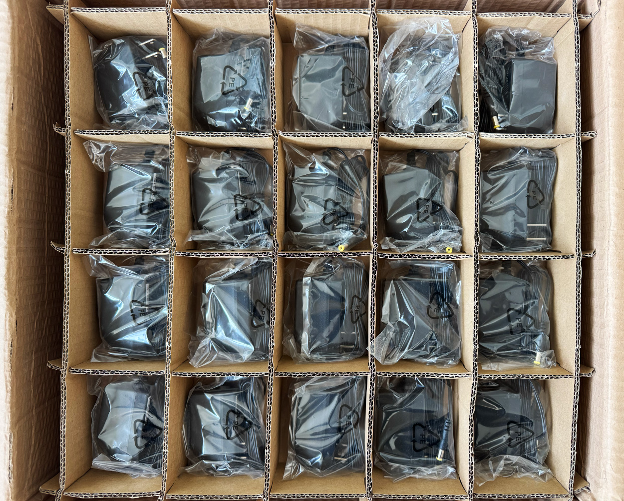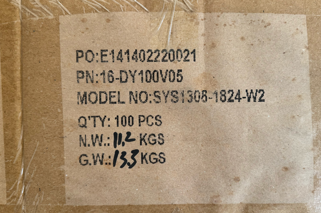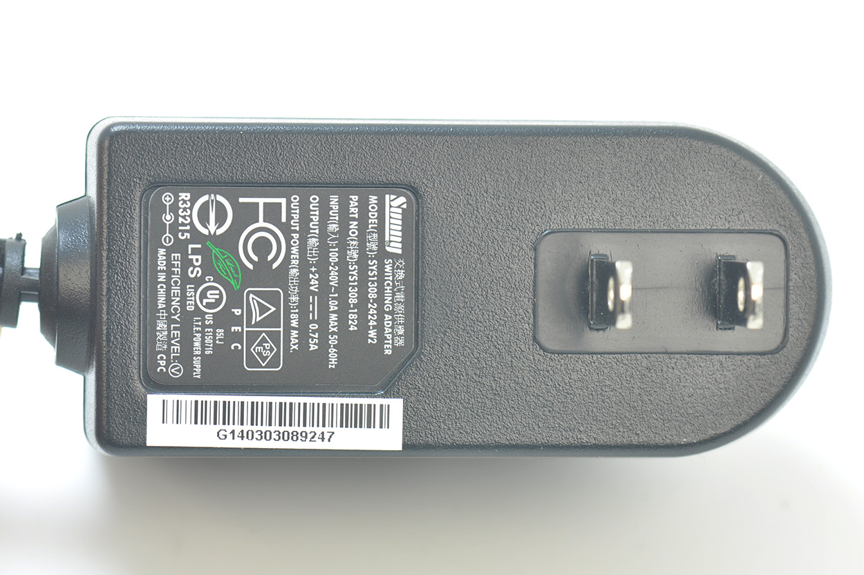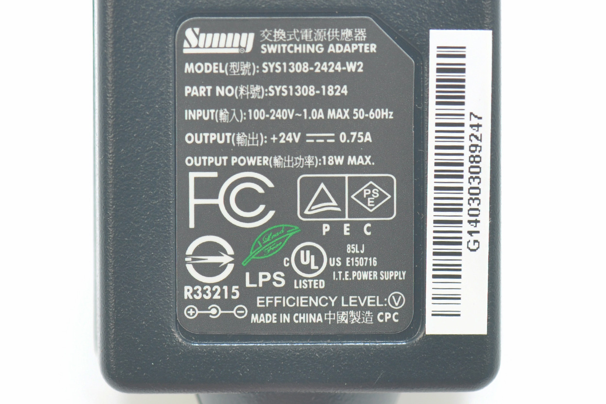 全新原箱到货,箱子侧面标签如下图,侧面有印PO:E141402220021 PN:16-DY100V05 MODEL NO :SYS1308-1824-W2 QTY:100PCS,净重11.2KG 毛重箱子13.3公斤。SUNNY交换式电源供应器 Swintching Adapter Model 型号为SYS1308-2424-W2 Part No料号为SYS1308-1824 Input输入100-240V Output 输出24V 0.75A Output Power输出功率18W。电源不含电源插脚长7.4厘米宽3.1高4.3厘米,线长1.58米,重112.9克。电源输出24V0.75A,DC接口标准DC孔外径: 5.5mm 内径:2.1mm,购买时注意核对接口,只要只要电压相同,接口相同就可以使用的。