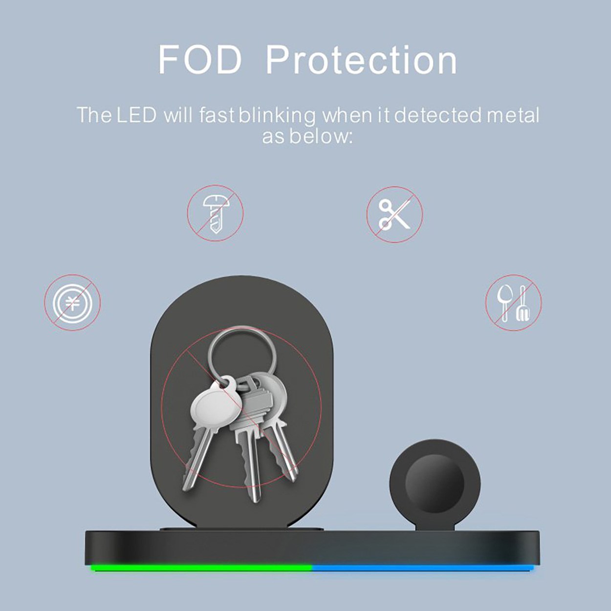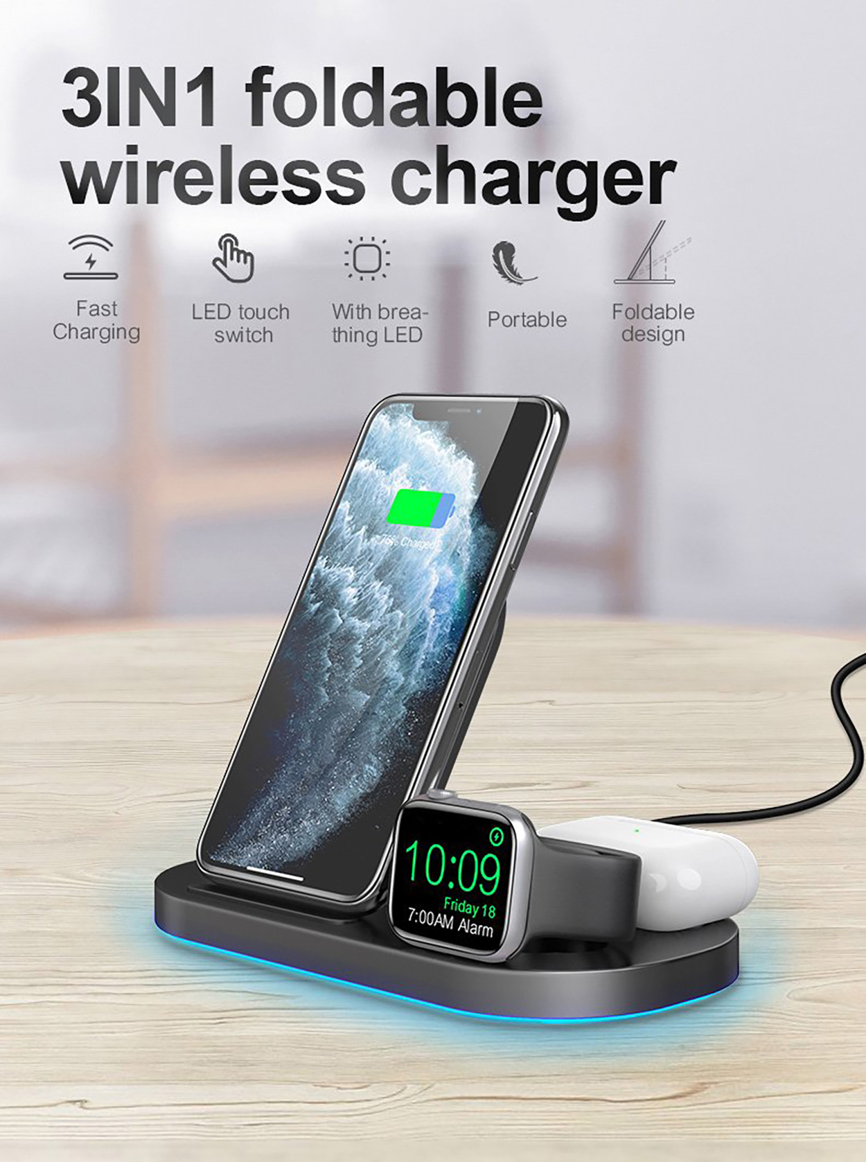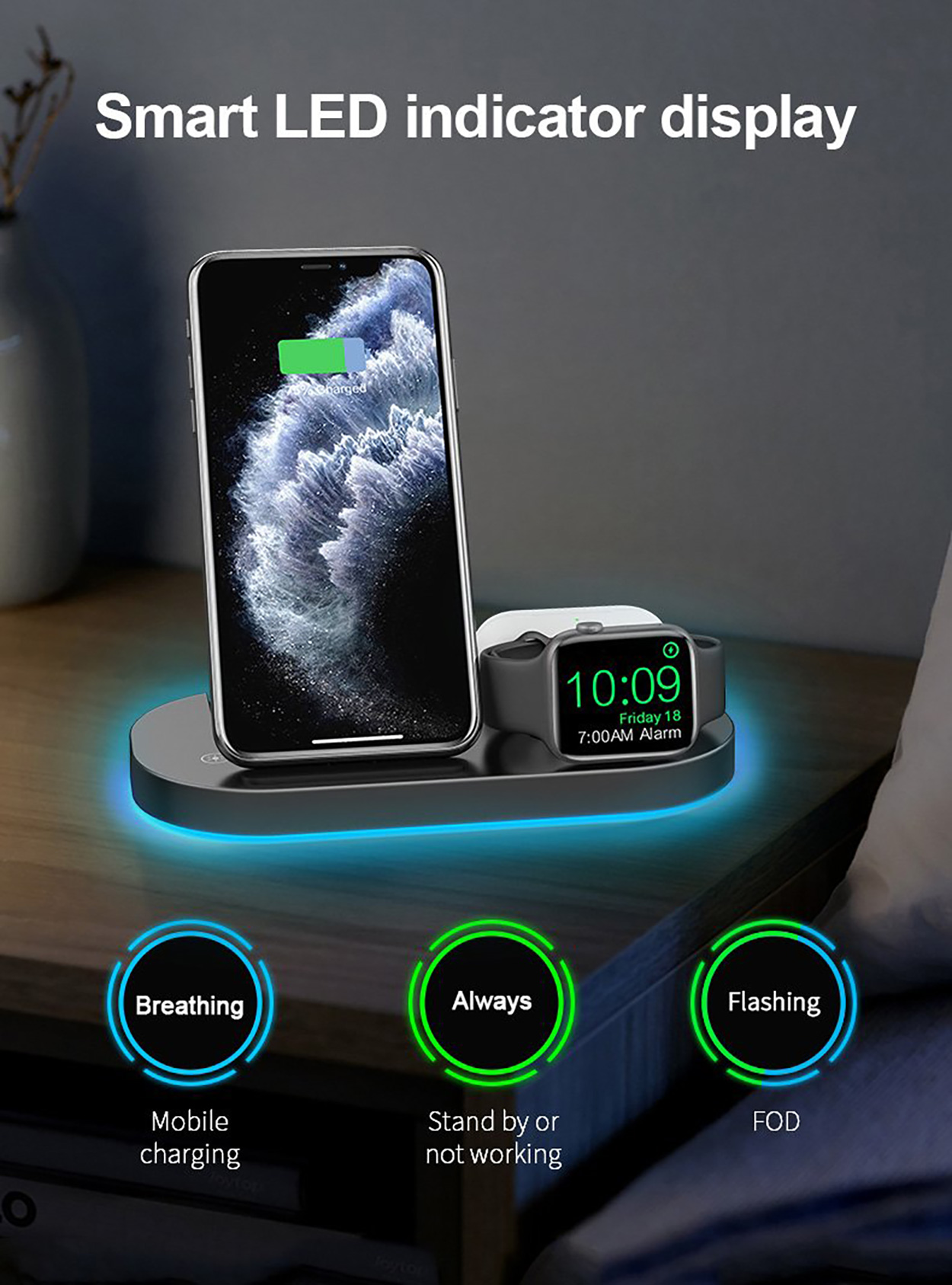 3合1无线充电器是一个紧凑的充电室,仅由一个插座供电,可以同时为3台设备充电。当为您的手机、苹果手表、AirPods 2或AirPods Pro或其他一些TWS充电时,只需戴上它们,无线充电将自动开始,所有这些都将使您的办公桌干净整洁,并使您的生活更轻松。充电器的设计非常节省空间,可以帮助您很好地整合手机的智能和生活,特别是对于苹果用户。此外,灯光环非常丰富多彩,并具有显示充电状态的流水灯效果,如果您想关闭或打开灯,只需触摸感应键即可。