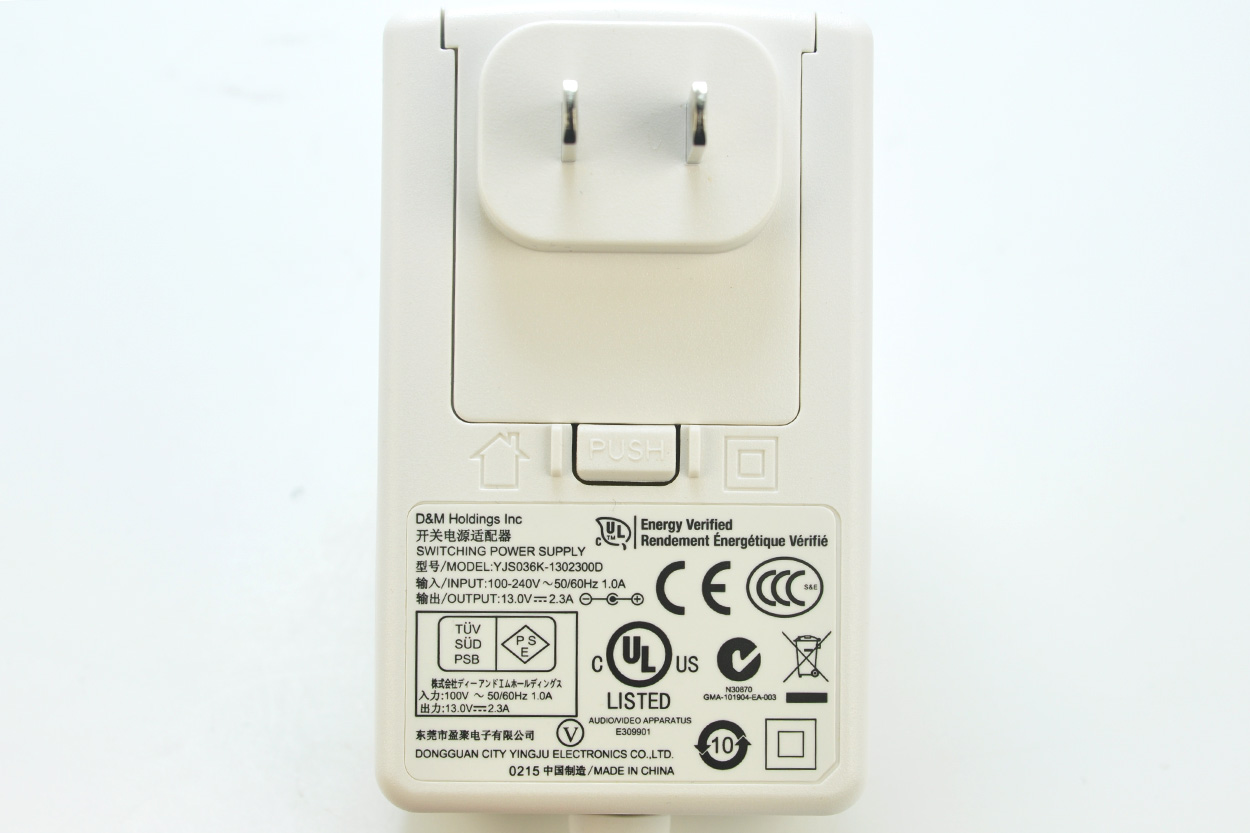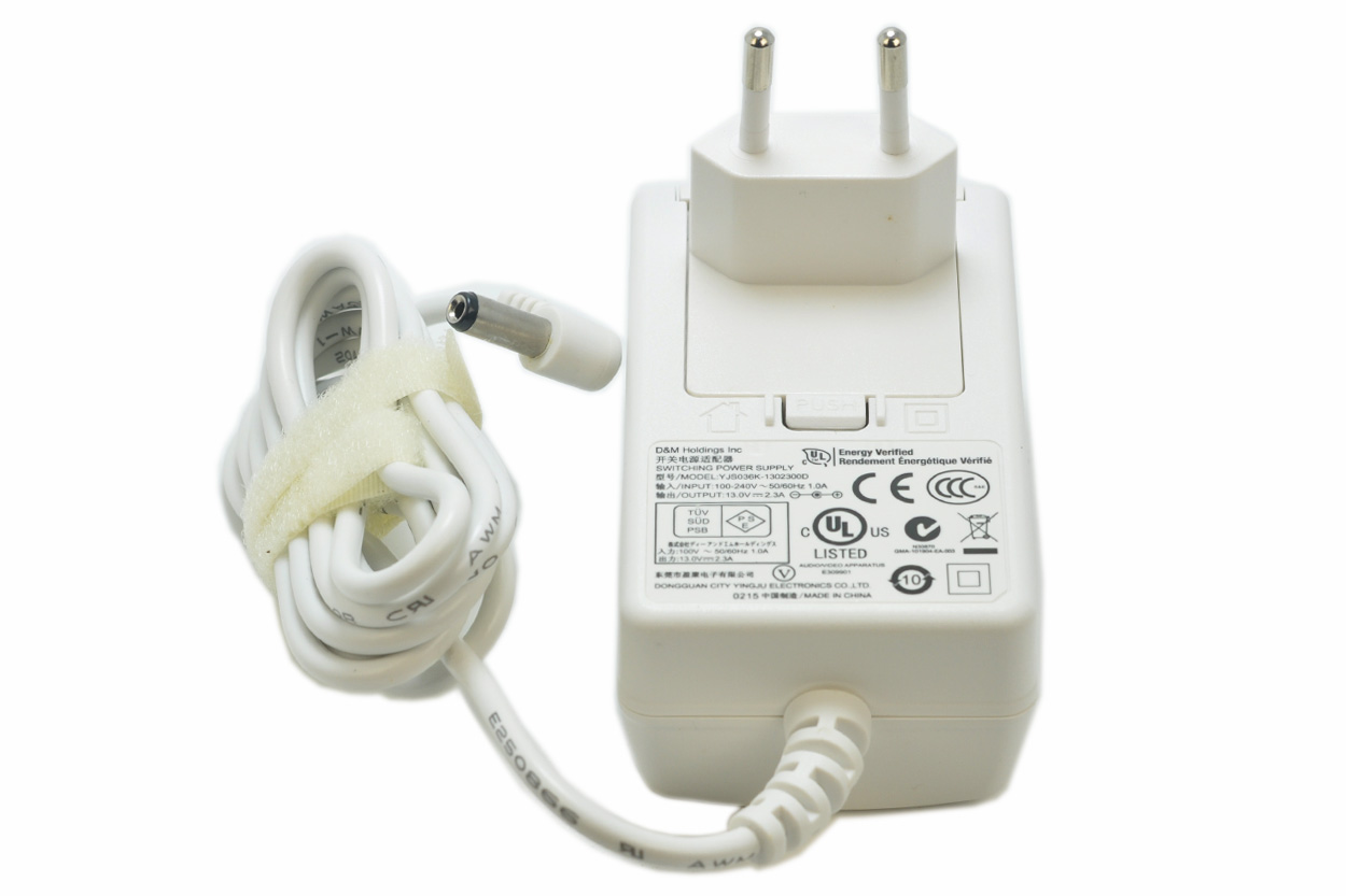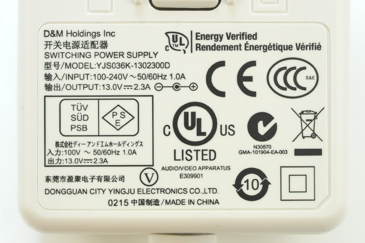 D&M Holdings Inc 开关电源适配器 SWITCHING POWER SUPPLY 型号/MODEL:YJS036K-1302300D 输入/INPUT:100-240V ~50/60Hz 1.0A 输出/OUTPUT:13.0V==2.3A AUDIONIDEO APPARATUS 东莞市盈聚电子有限公司 E309901 DONGGUAN CITY YINGJU ELECTRONICS CO.,LTD. 0215 中国制造/MADE IN CHINA