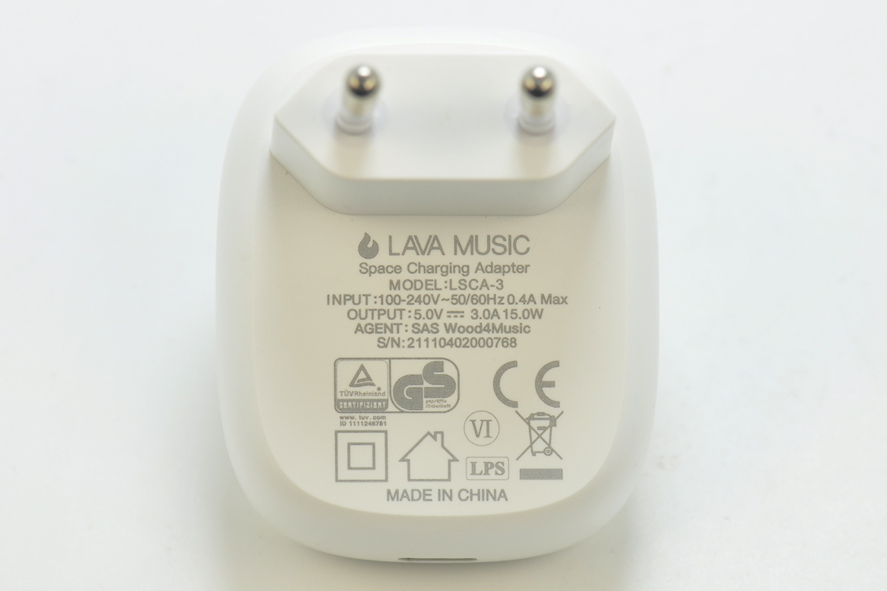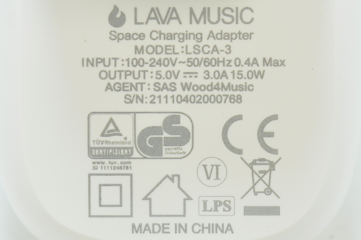 LAVA MUSIC Space Charging Adapter MODEL:LSCA-3 INPUT:100-240V~50/60Hz 0.4A Max OUTPUT: 5.0V=: 3.0A15.0W AGENT: SAS Wood4Music S/N: 21110402000768这个序列号每个电源全不一样。