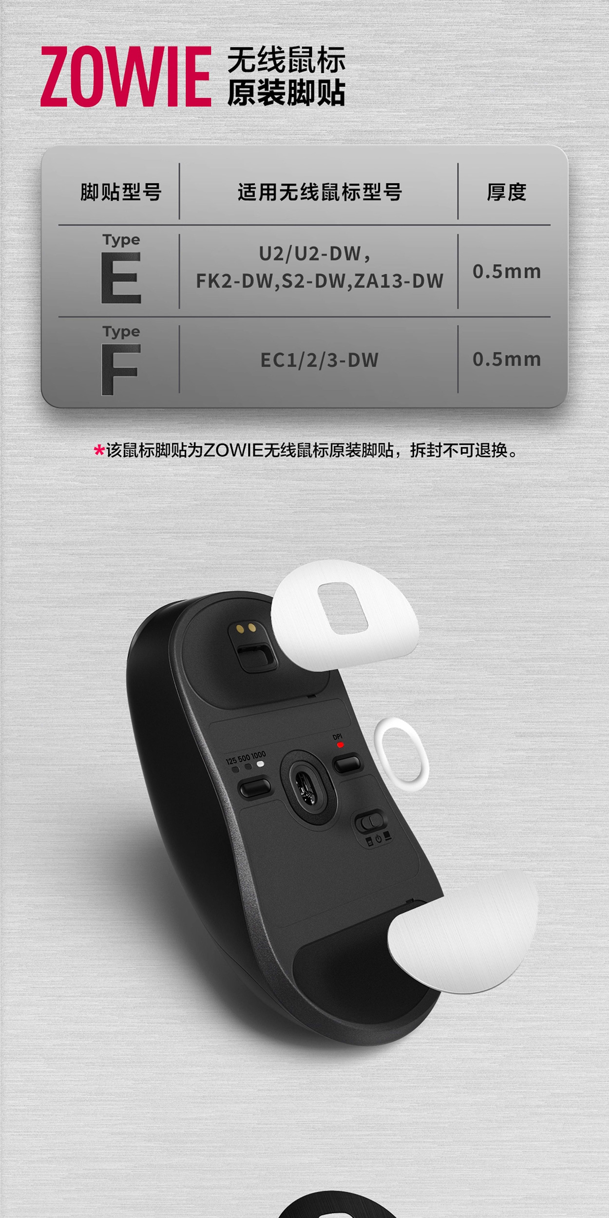 ZOWIE Skatez-Type F 电竞鼠标脚贴是明基 ZOWIE 推出的特氟龙材质脚贴,分为黑色平稳版与白色顺滑版,均针对EC1-DW、EC2-DW、EC3-DW 型号鼠标设计,更换后可快速恢复鼠标原始滑动性能,提升游戏操作体验。