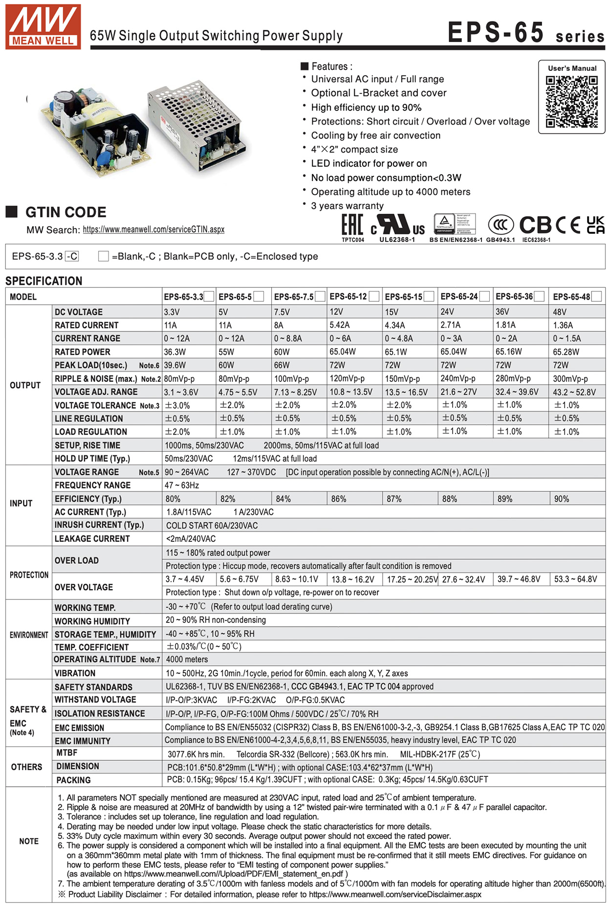 明纬 EPS-65-12 是一款65 瓦单路输出开关电源,输出规格为 12V 5.42A(输出电流范围 0 至 5.42 安培,额定输出功率 65.04 瓦,最大输出功率 72 瓦),输出纹波噪声≤120 毫伏峰峰值,输出电压可调范围为 10.8 至 13.5 伏。