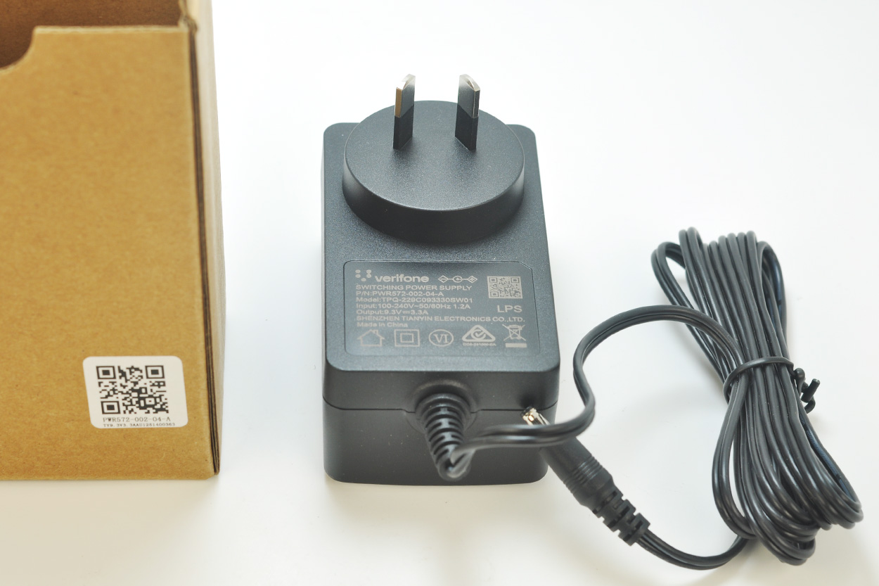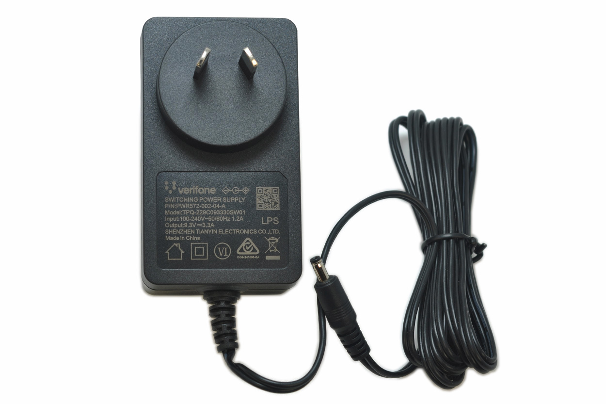 澳标外八角Verifone SWITCHING POWER SUPPLY 配件号P/N:PWR572-002-04-A 型号Model:TPQ-229C093330SW01 输入Input:100-240V-50/60Hz 1.2A 输出Output: 9.3V 3.3A CONFORMS TO UL STD.62368-1 CERTIFIED TO CSA STD. C22.2 NO.62368-1 CAN ICES-003 (B)NMB-003 (B) SHENZHEN TIANYIN ELECTRONICS CO.,LTD. Made in China