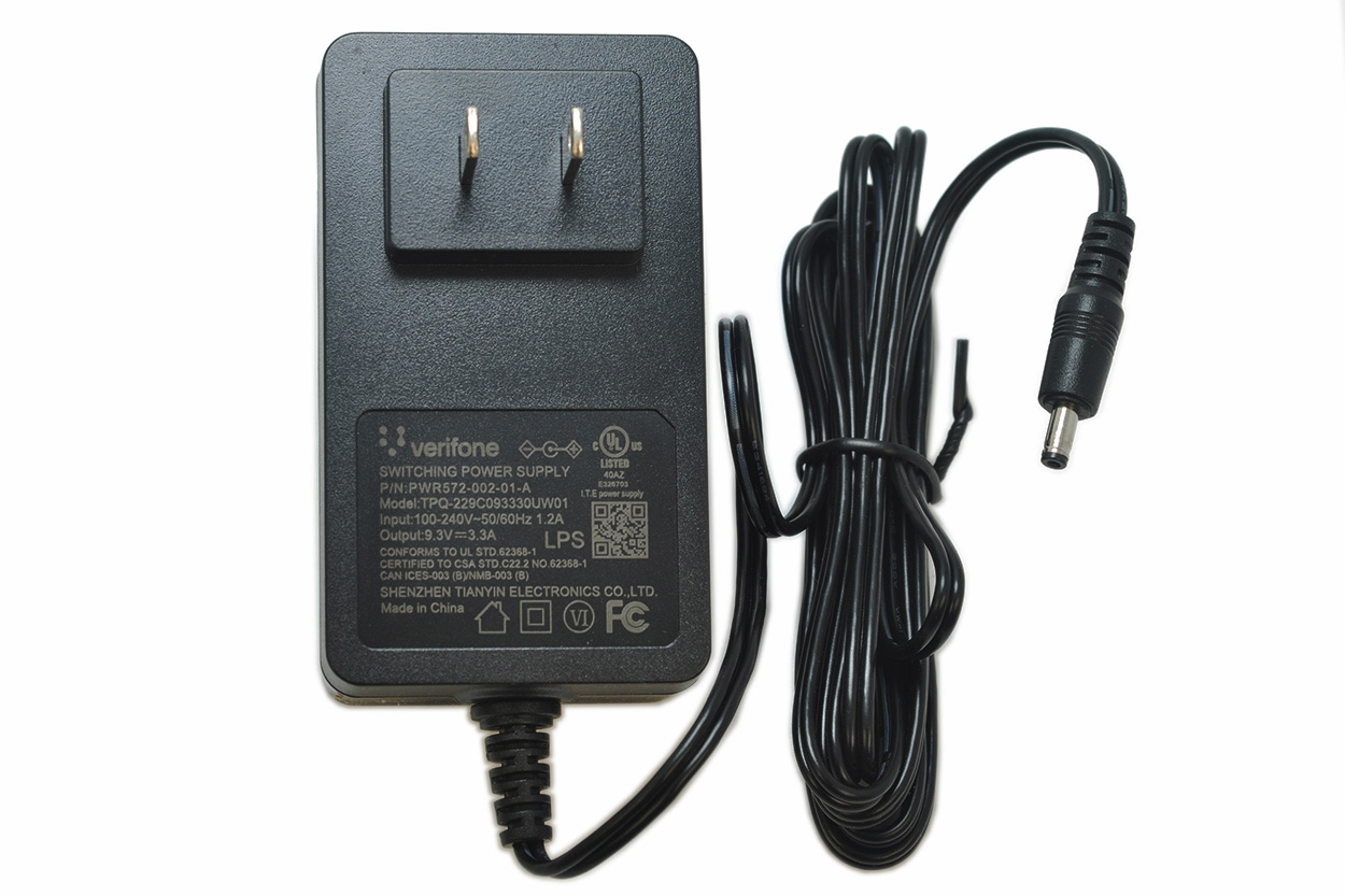 美标国标二插Verifone SWITCHING POWER SUPPLY 配件号P/N:PWR572-002-01-A 型号Model:TPQ-229C093330UW01 输入Input:100-240V-50/60Hz 1.2A 输出Output: 9.3V 3.3A CONFORMS TO UL STD.62368-1 CERTIFIED TO CSA STD. C22.2 NO.62368-1 CAN ICES-003 (B)NMB-003 (B) SHENZHEN TIANYIN ELECTRONICS CO.,LTD. Made in China