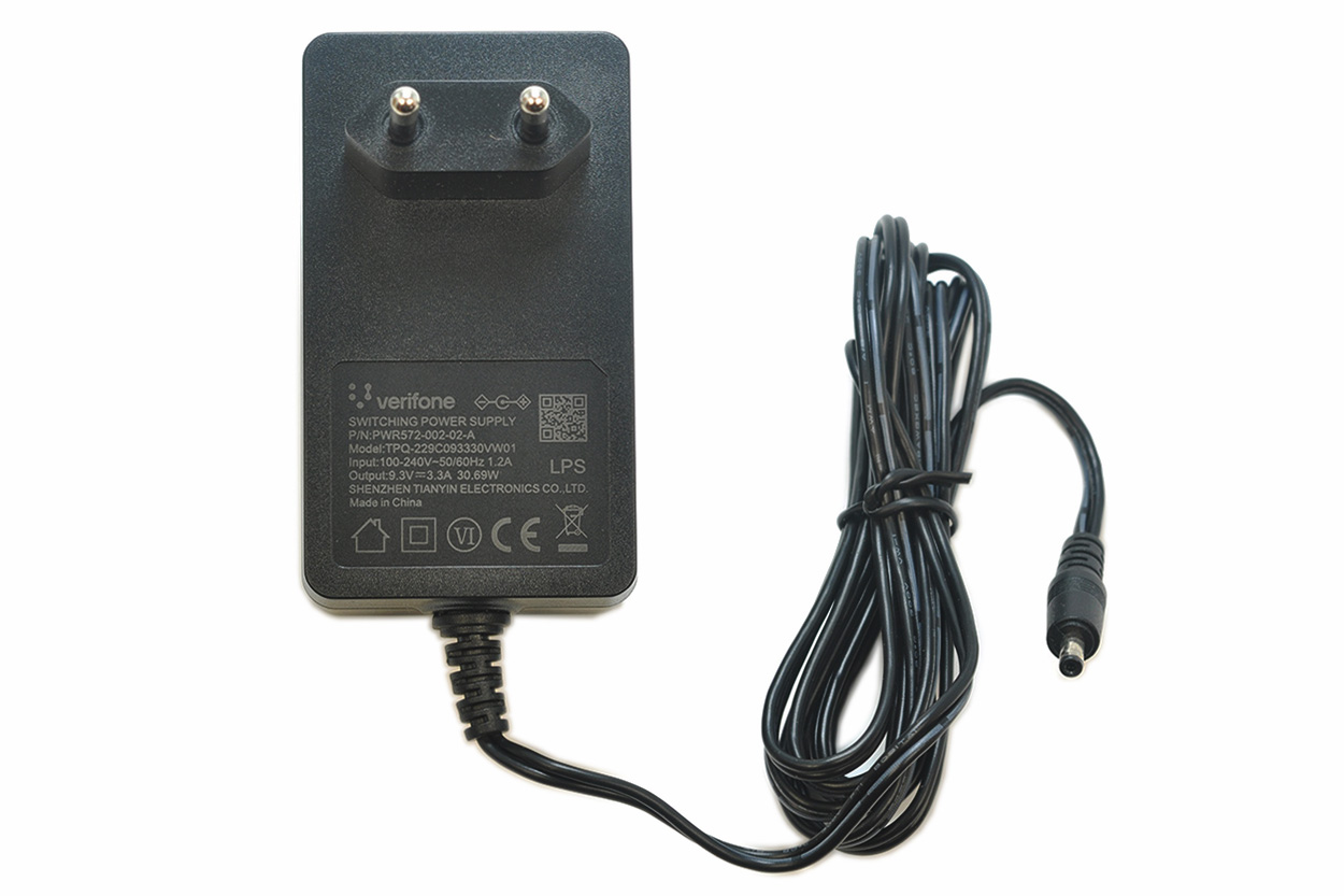欧标二园插Verifone SWITCHING POWER SUPPLY 配件号P/N:PWR572-002-02-A 型号Model:TPQ-229C093330VW01 输入Input:100-240V-50/60Hz 1.2A 输出Output: 9.3V 3.3A CONFORMS TO UL STD.62368-1 CERTIFIED TO CSA STD. C22.2 NO.62368-1 CAN ICES-003 (B)NMB-003 (B) SHENZHEN TIANYIN ELECTRONICS CO.,LTD. Made in China
