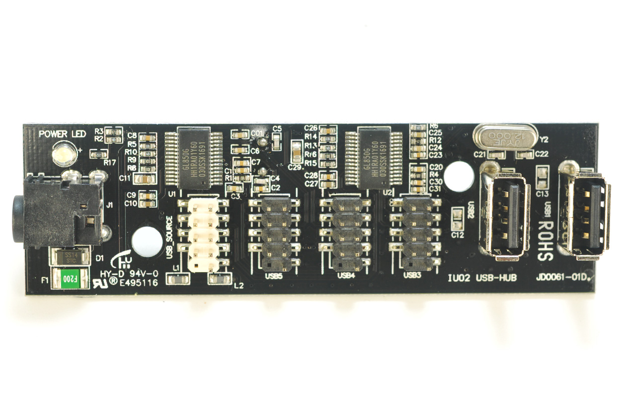 恩杰NZXT Internal USB Hub AC-IUSBH-M1的主板内部实物如下图,彩用了两个GL850G的USB主控芯片。