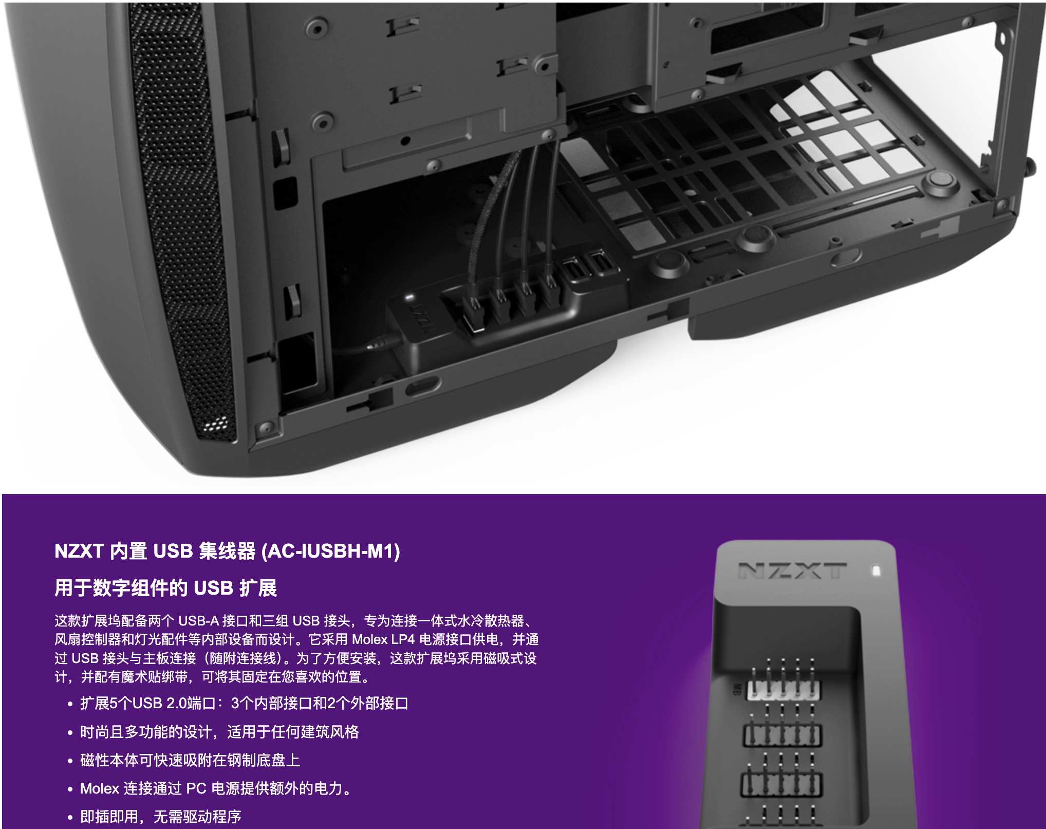 小熊网站又多了鸡肋玩意,你说它有用呢,也有用,说他没用,也没啥用,全新原箱到货,下拉有拆解,这个适合机箱DIY用,机箱内部磁吸扩展很方便。恩杰NZXT AC-IUSBH-M1内置USB集线器可增强系统与内部USB 2.0 设备的连接能力。它提供 3 个内部接口和 2 个外部接口,可连接最新的一体式水冷散热器、风扇控制器和灯光配件。内置 USB 集线器配备专用Molex电源线,可为所有连接的设备提供充足的电力。集线器采用磁吸式设计和理线带,方便快速安装和隐藏,轻松实现 USB 设备的未来扩展。