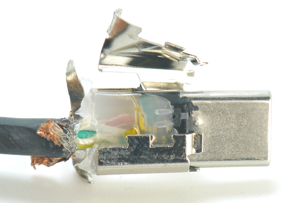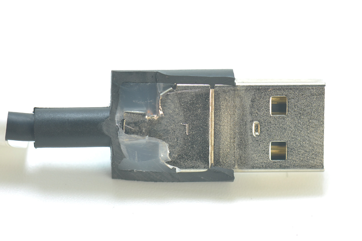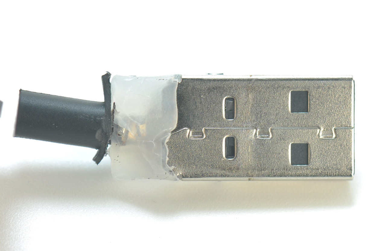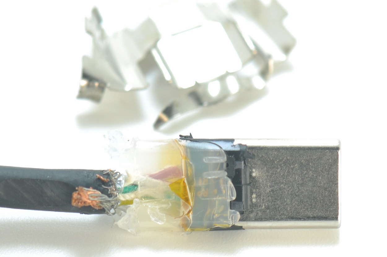 再拆一下USB-A口,切开外面的注胶后,可以看到A口的金属屏蔽壳。