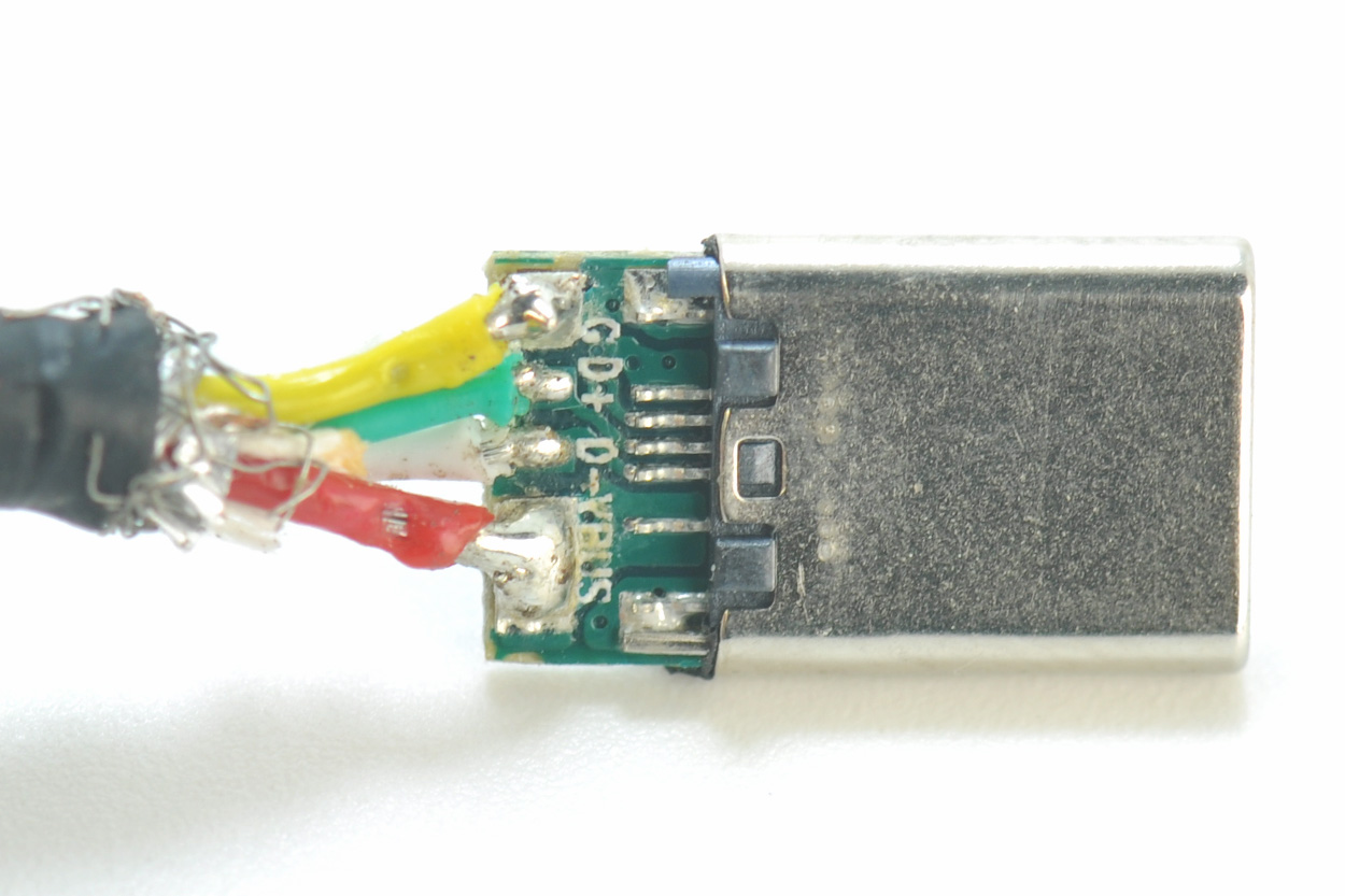 拆开外面的金属屏蔽壳后可以看到镀金的USB接针。