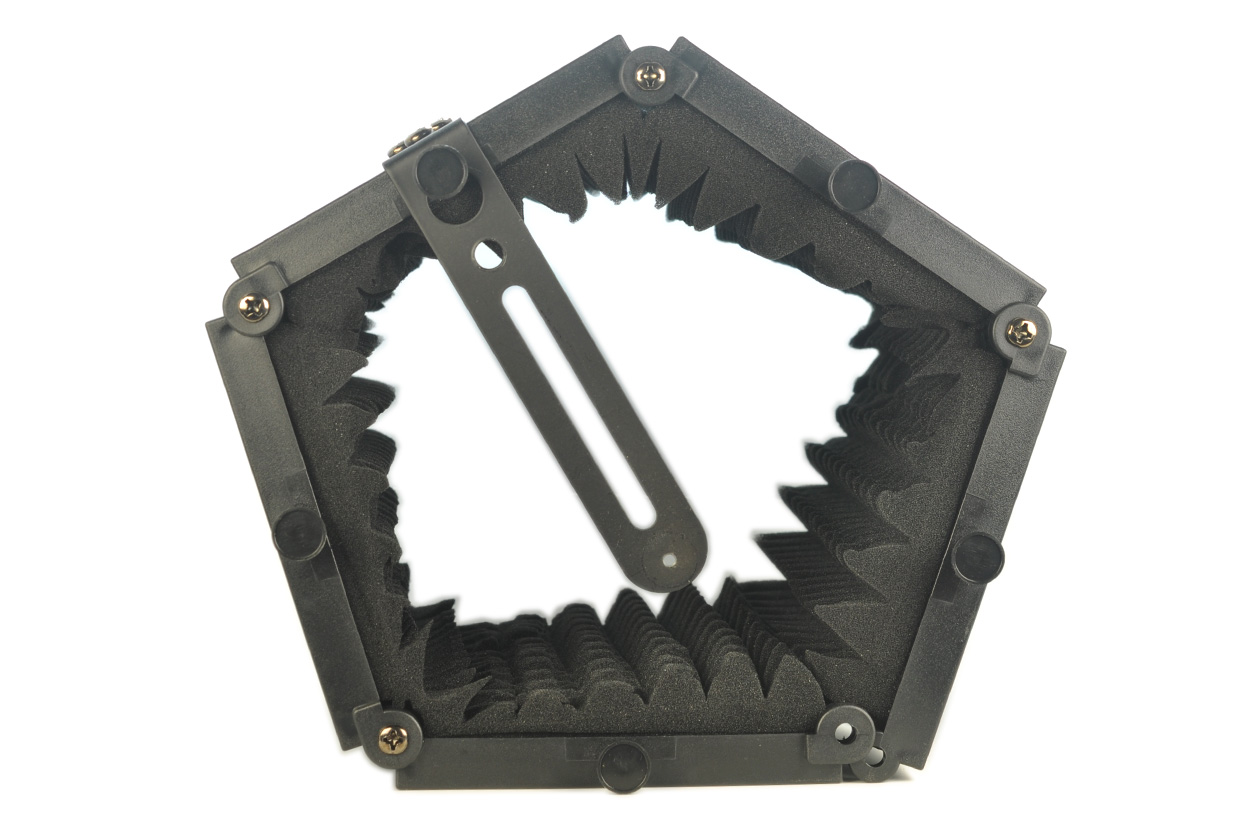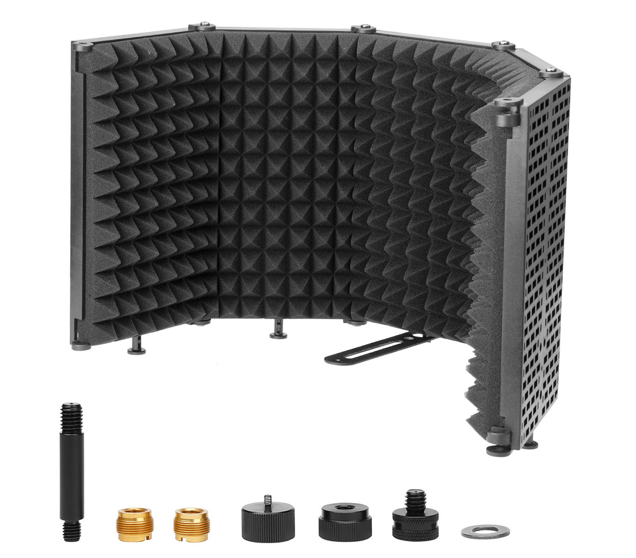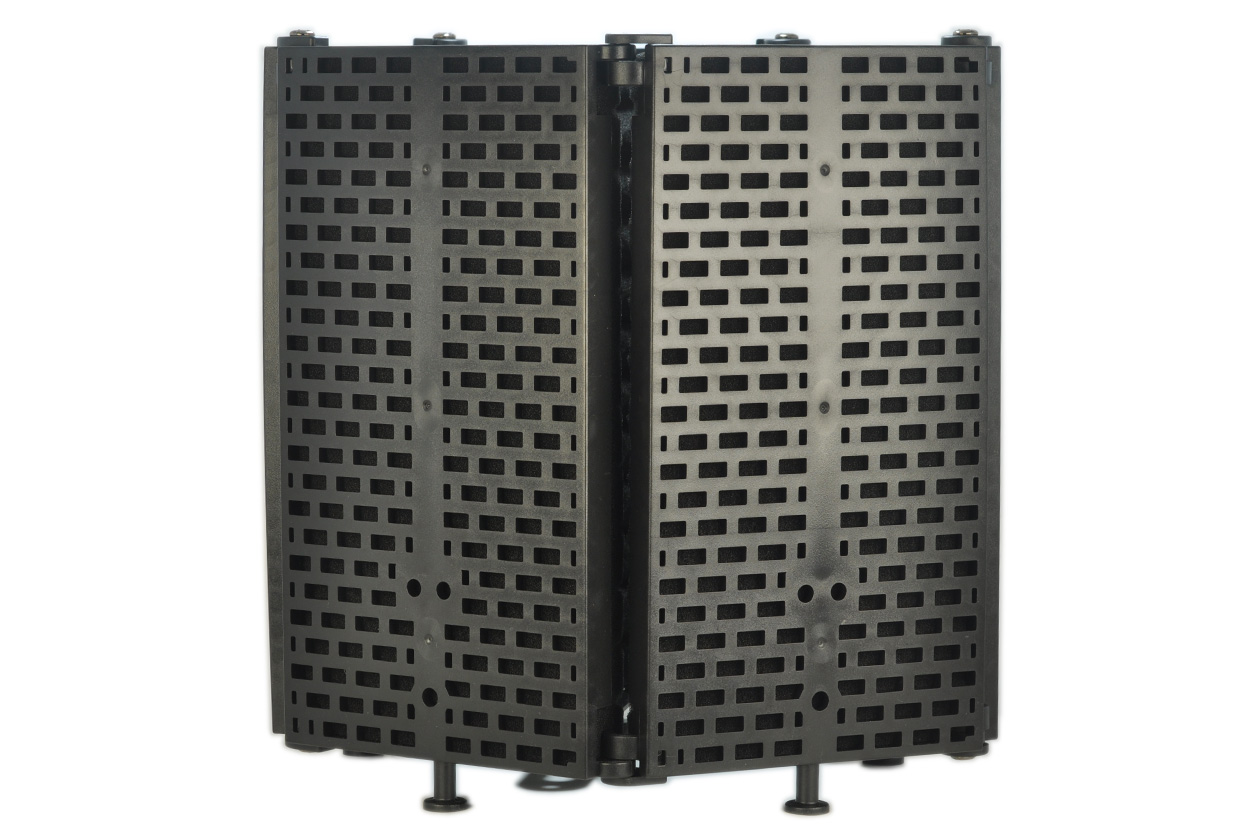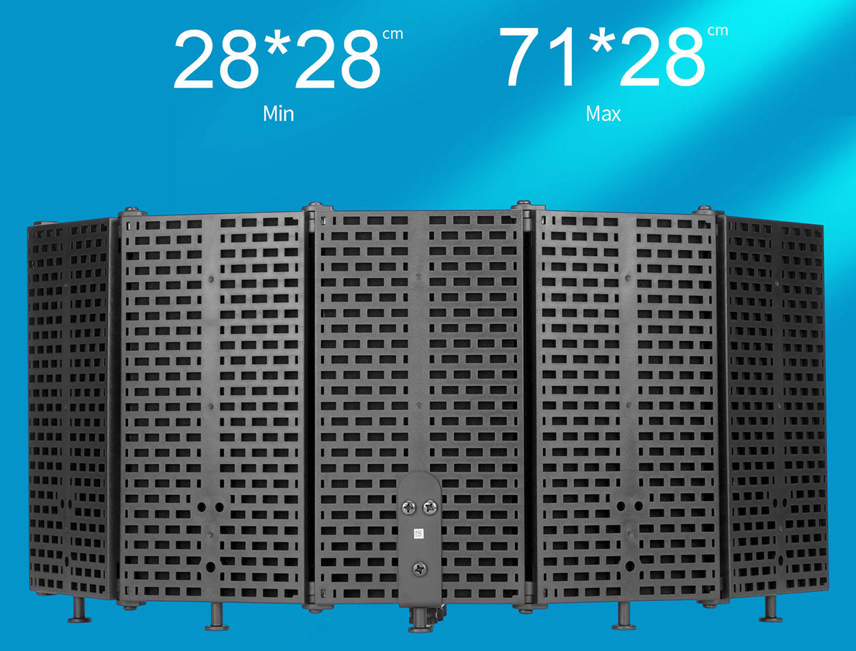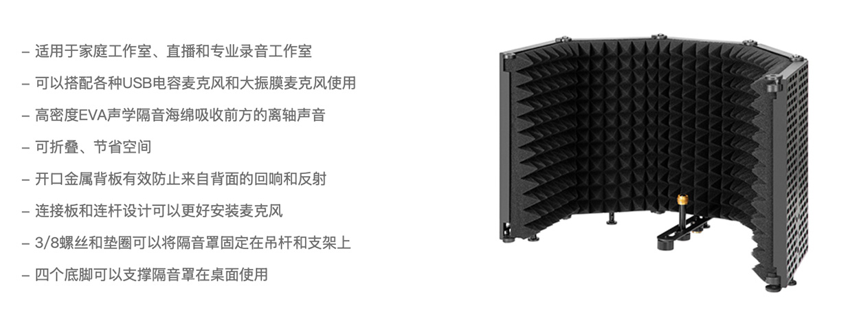 博雅BY-RF5P是一个可折叠麦克风隔音罩,非常适合家庭录音工作室、直播,甚至是专业人声录音使用。装配了高密度的EVA声学隔音海绵和开口金属背板。声学隔音海绵可以吸收来自正面的离轴声音以减少空间回响和声音反射的产生。同时,背面金属板上的小洞使得从背面来的低频声音反射可以穿过金属板以被隔音海绵吸收。自带一个狭长的连接板和一系列配件,这使得麦克风安装和隔音罩安装更加方便。用户可以安装一个连杆在连接板上,再通过连杆上的5/8螺丝或者外加一个5/8转3/8的转接螺丝来安装麦克风。同时它还可以通过3/8螺丝和垫圈连接到支架和吊杆上。另外这个隔音罩设计有四个支撑脚,使得它可以在桌面站立使用,当你需要在桌面创作或者在桌面直播将非常有用。