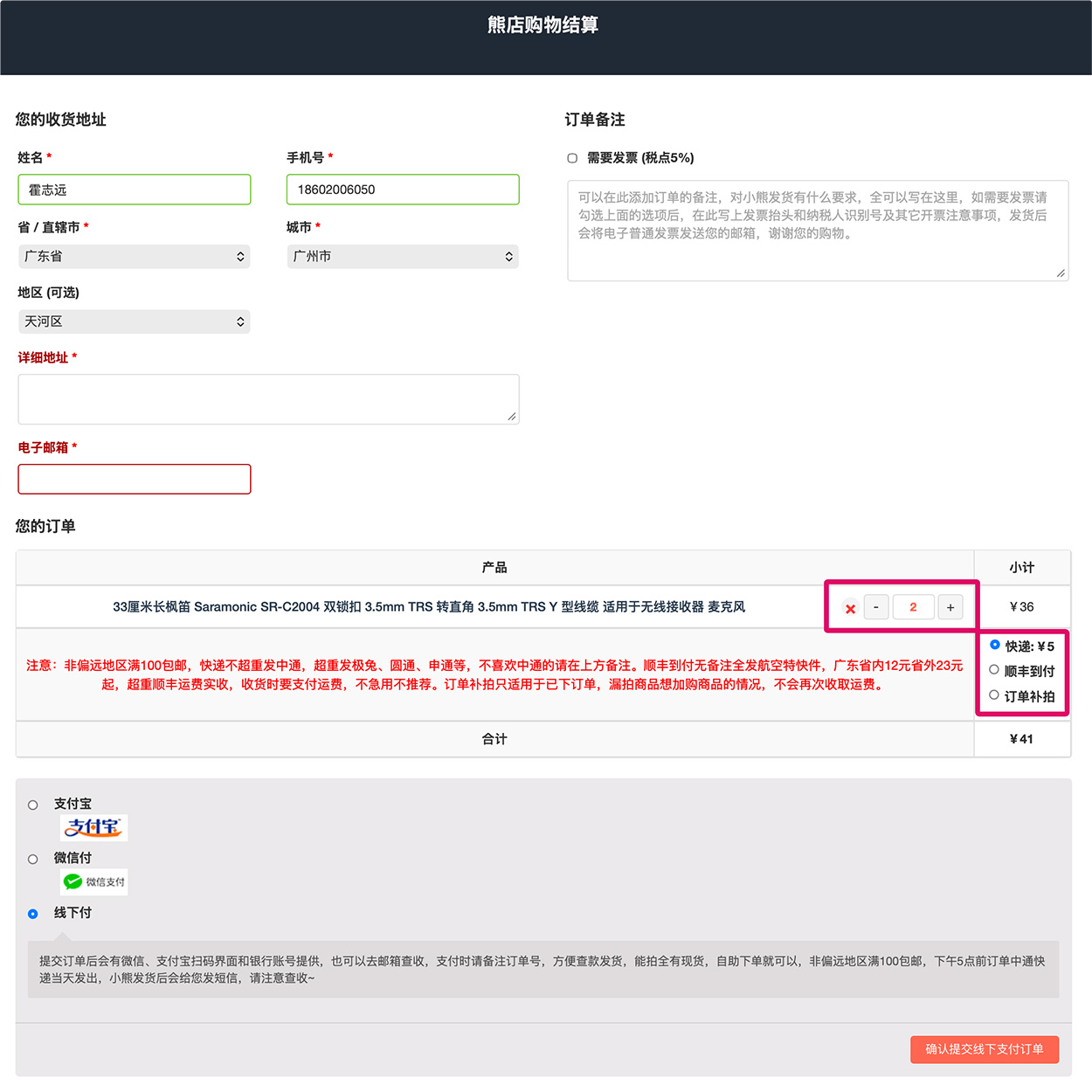 下面这个功能是顺手加的,可以在结算提交订单的页面加减删除商品和选择快递方式,订单补拍就是你刚下了订单,想再加个商品,选这个就没有运费了。