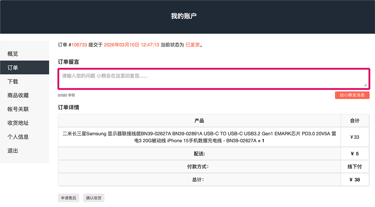 还有一些别的细节上的修改,如商品收藏,确认收货、订单售后等等,但没有上面两个功能方便,订单中留言可以更方便的来处理售后和解决问题。