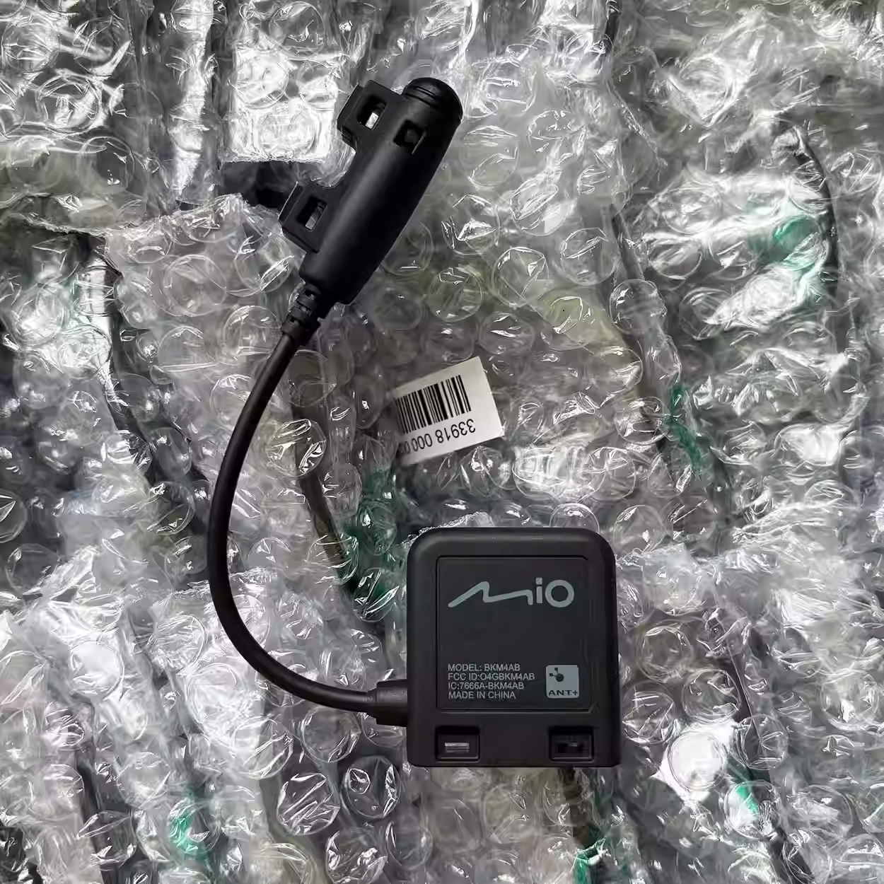 传感器速度端正面标签如下图,上部分有Mio的标志,下面有 MODEL: BKM4AB FCC ID:04GBKM4AB IC:7666A-BKM4AB MADE IN CHINA 右下角就是ANT+小蚂蚁的标志。